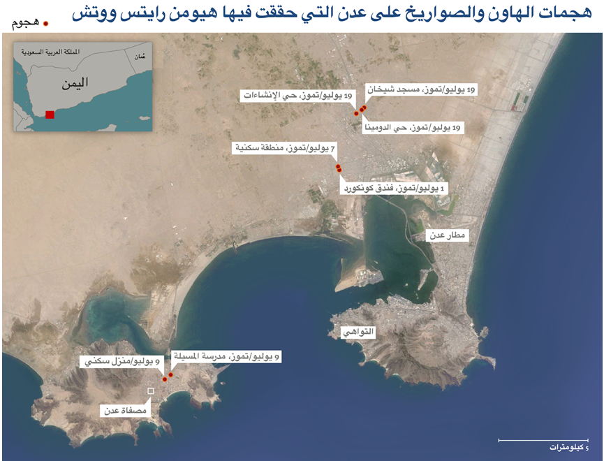 زارت هيومن رايتس ووتش 4 مناطق في عدن تخضع لسيطرة قوات المقاومة الجنوبية وتعرضت لنيران الصواريخ والهاون الحوثية منذ الأول من يوليو/تموز. كما أجرت هيومن رايتس ووتش مقابلات هاتفية مع 4 من سكان عدن، وراجعت أدلة فوتوغرافية ومقاطع فيديو منشورة على مواقع التواصل الاجتماعي عن الهجمات وآثارها.