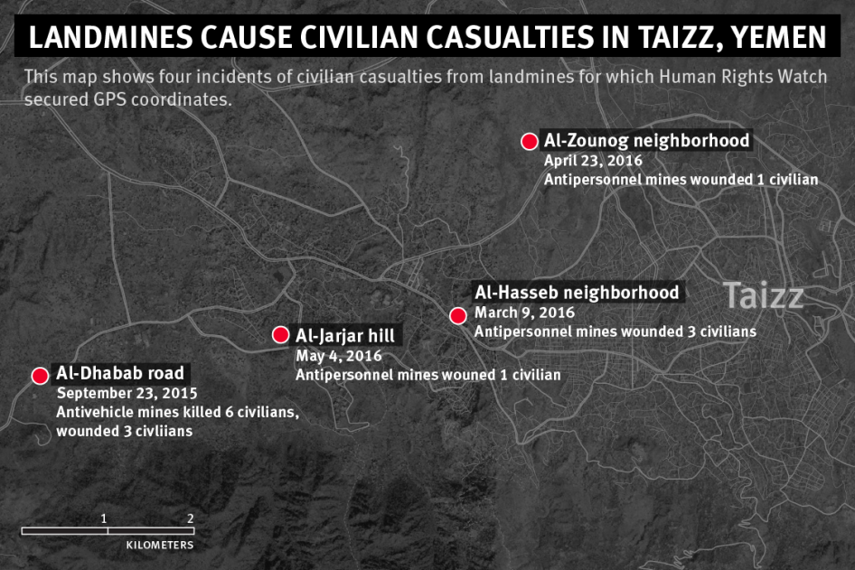 قال أخصائيون يمنيون في إزالة الألغام في تعز وطواقم طبية إن الألغام الأرضية تسببت في عشرات الإصابات بين المدنيين منذ مارس/آذار. حققت هيومن رايتس ووتش في 5 حالات لأشخاص بُترت أطرافهم بسبب الألغام المضادة للأفراد في تعز منذ مارس/آذار .
