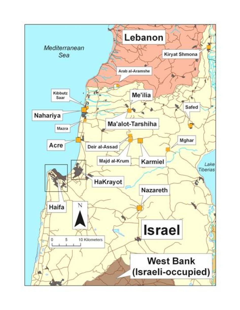 خريطة لشمال إسرائيل تظهر مواقع القصف الصاروخي الموصوفة في هذا التقرير © 2007 هيومن رايتس ووتش