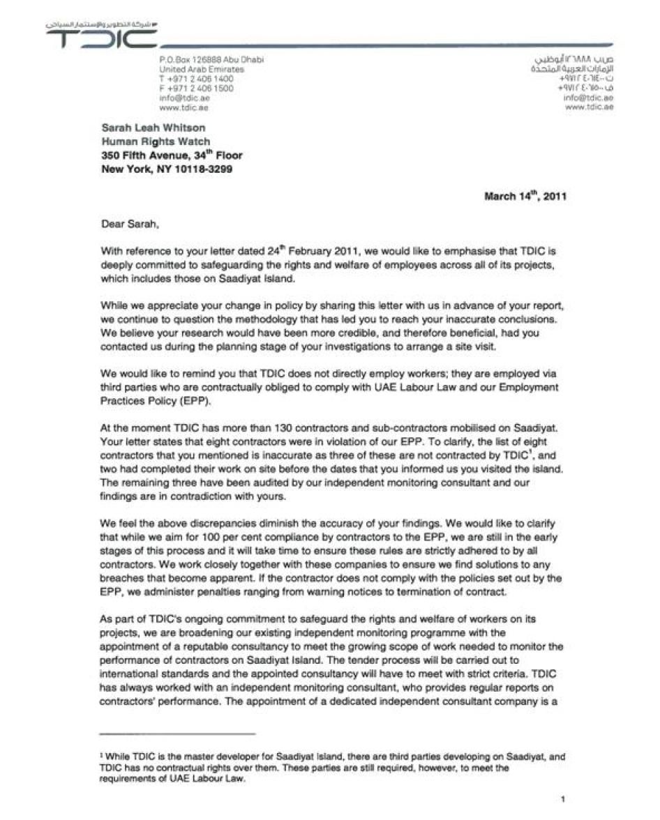 في فبراير/شباط 2011 عرضت هيومن رايتس ووتش أحدث ما توصلت إليه من نتائج في رسالة لم تُنشر (وهي منشورة في ملحق هذا التقرير) أرسلتها إلى الأطراف الأساسية في مشروع تطوير جزيرة السعديات، ومنها شركة التطوير والاستثمار السياحي، وجهاز الشؤون التنفيذية لأبو ظبي، وجامعة نيويورك وغوغنهايم ووكالة المتاحف الفرنسية، وعقدت اجتماعات مع جامعة نيويورك وغوغنهايم واللوفر، وألقت الضوء على استمرار الانتهاكات في الجزيرة، وشددت مرة أخرى على الحاجة للمراقبة المستقلة والتعويض والإنصاف الحقيقيين للعمال الذين يسيئ إليهم أصحاب عملهم ومكاتب الاستقدام. بينما ردت جميع المؤسسات على النتائج الواردة في خطابنا، فإن ردودهم تباينت بشدة من حيث المعلومات التي وفروها، واستعدادهم للإقرار بانتهاكات حقوق الإنسان والتصدي لها، تلك التي تسببت فيها ممارسات العمل المتبعة بشكل عام في الإمارات. ولقد أكدت جميع المؤسسات على الأقل على التزام عام بحماية حقوق العمال في مواقع الإنشاءات الخاصة بكل منهم.[4]