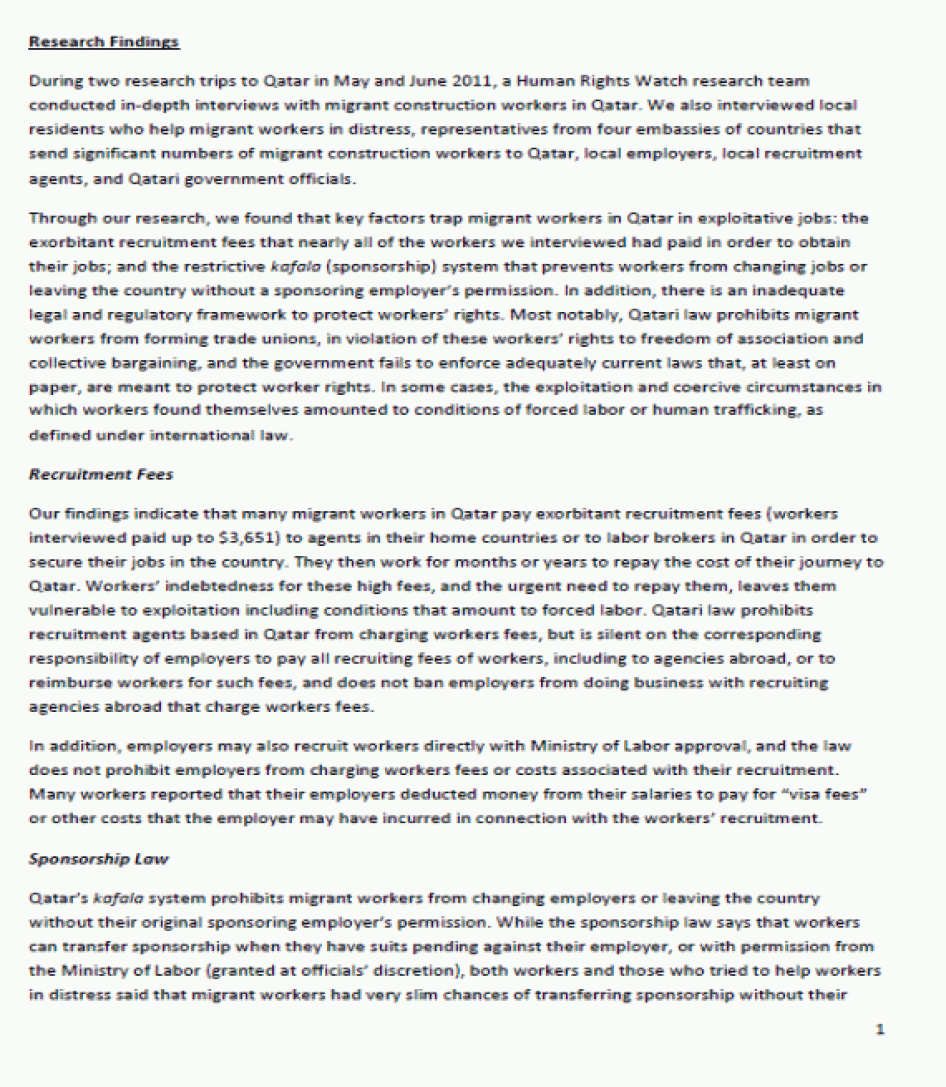 وبناء على مقابلات مع 73 عاملاً وافداً بمجال الإنشاءات في قطر، ومع أصحاب عمل من صناعة الإنشاءات، ومع مسؤولين حكوميين ودبلوماسيين وملحقين عماليين من كبرى الدول الراسلة للعمالة، ومع صحفيين وأكاديميين ومدافعين عن حقوق العمال، وكذلك بناء على مراسلات مع مسؤولين حكوميين وشركات؛ يبحث التقرير في العوامل الأساسية التي تؤدي إلى حصار العمال في وظائف تشوبها أوجه الاستغلال، بما في ذلك التعرض لرسوم الالتحاق الباهظة بالعمل ، ونظام الكفالة التقييدي الذي يمنع العمال من تغيير وظائفهم أو الخروج من قطر دون موافقة الكفيل. وفي أسوأ الحالات، وصف بعض العمال أوضاعاً ترقى لمستوى العمل القسري. وبناء على طلب العمال الذين تحدثنا إليهم، لم يذكر التقرير أسماء أصحاب عملهم.