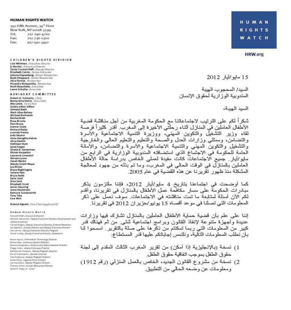 أثناء العمل البحثي في المغرب، قابلت هيومن رايتس ووتش وزير التشغيل والتكوين المهني، ووزير التضامن والمرأة والأسرة والتنمية الاجتماعية، وممثلين عن وزارات العدل والحريات والصحة والتعليم والتعليم العالي والأمانة العامة للحكومة. كما قابلنا عاملين بوحدة حماية الطفل في الدار البيضاء، وهي تعمل تحت توجيه وزارة التضامن والمرأة والأسرة والتنمية الاجتماعية، ومن المجلس الوطني لحقوق الإنسان. إثر زيارتنا للمغرب، طلبنا معلومات إضافية من المندوبية الوزارية لحقوق الإنسان (وهي هيئة حكومية مشكلة في عام 2011 لتكوين وتنفيذ سياسة الحكومة إزاء حقوق الإنسان) بشأن المبادرات الحكومية التي تتصدى لعمل الأطفال بالمنازل وتطبيق القوانين القائمة ذات الصلة. ذكرنا في التقرير المعلومات التي تلقيناها من المندوبية الوزارية حتى 15 يونيو/حزيران 2012، وأعدنا طباعتها في ملحق التقرير. كما راجعنا المصادر الثانوية المتوفرة، ومنها دراسات مسحية وميدانية، وتقارير حكومية، وتقارير منظمات مجتمع مدني، وأخبار في الإعلام، وغيرها من المواد ذات الصلة.