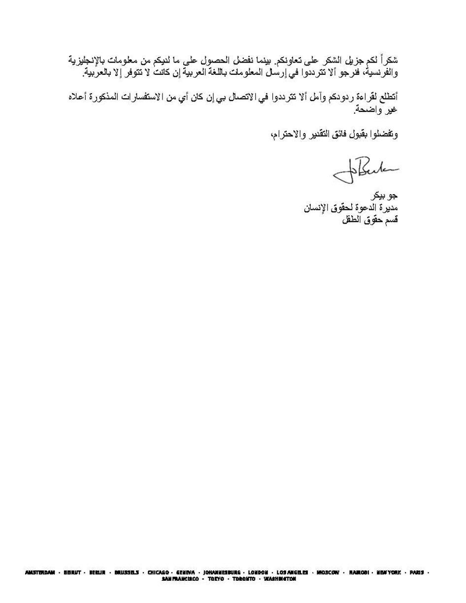 [119] المندوبية الوزارية لحقوق الإنسان، 15 يونيو/حزيران 2012، رسالة إلى هيومن رايتس ووتش.