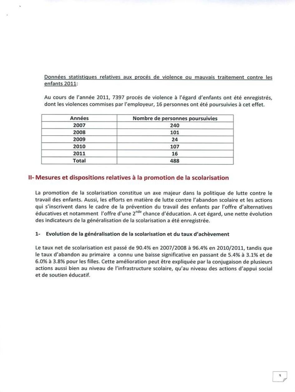 [135] المندوبية الوزارية، 15 يونيو/حزيران 2012.لم تشمل المعلومات التي تم توفيرها تحديد الفترة الزمنية التي تمت أثنائها معالجة هذه الحالات.