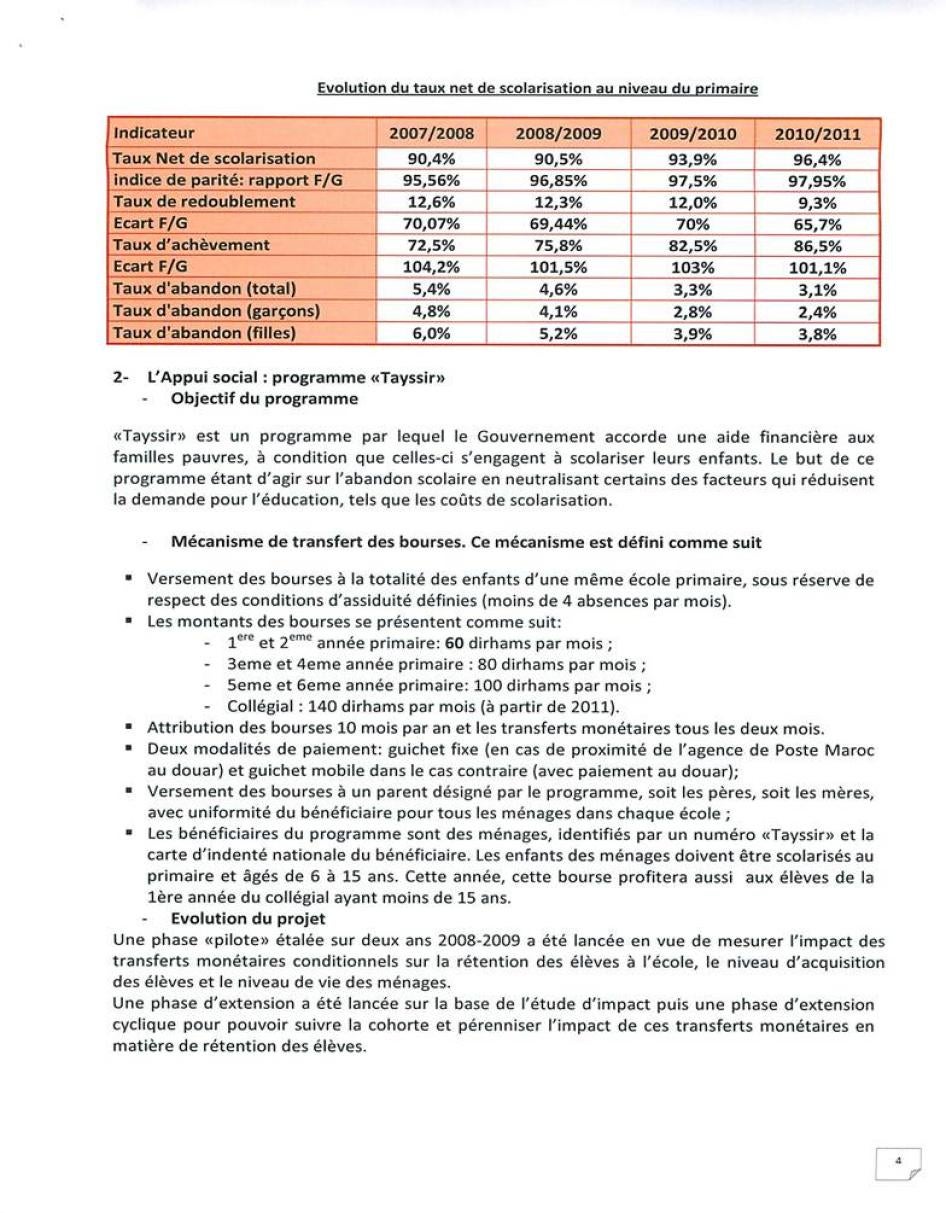 [118] يحصل الأطفال في الفرقتين الأولى والثانية من التعليم الابتدائي على 60 درهماً/الشهر. في الفرقتين الثالثة والرابعة: 80 درهماً/الشهر، الخامس والسادس 100 درهم/الشهر، بداية من عام 2011 من هم في المرحلة الثانية يحصلون على 140 درهماً/الشهر.