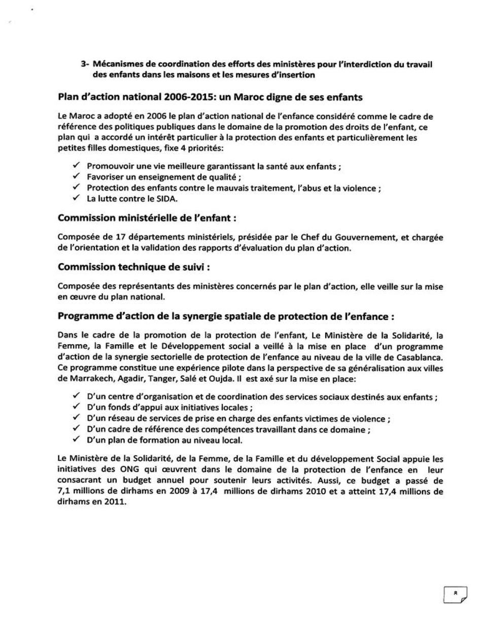 وهيأت الحكومة في خمس مدن وحدات لحماية الأطفال لمساعدة من يقعون ضحايا للعنف أو سوء المعاملة، وقد يشمل ذلك عاملات منازل قاصرات قمن بالفرار من أصحاب عمل مسيئين. وأنشأت وزارة التشغيل والتكوين المهني وحدة مركزية لعمل الأطفال وأعدت نقاط خاصة بعمل الأطفال في 43 مفتشية عمل، وقامت بالتعاون مع منظمة العمل الدولية واليونسيف، بتدريب مفتشي عمل ومسؤولين حكوميين آخرين على تطبيق قوانين عمل الأطفال. في عام 2010 صدر قرار حكومي بزيادة أنواع الشغل التي تعتبر خطيرة مع حظرها بالنسبة للأطفال تحت 18 عاماً. يحظر القرار بعض المهام المتعلقة بعمل الأطفال في الخدمة المنزلية، لكنه لا يحظر تحديداً قيام الأطفال بالعمل المنزلي.