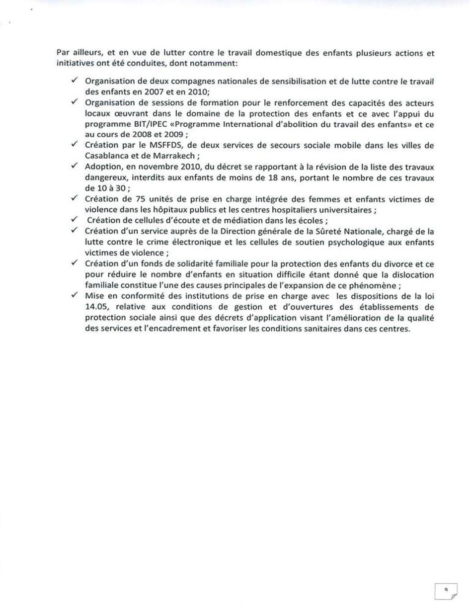 - ملاحقة الأفراد المسؤولين عن أعمال عنف ومخالفات جنائية أخرى ضد عاملات منازل قاصرات وذلك بموجب القانون الجنائي المغربي.