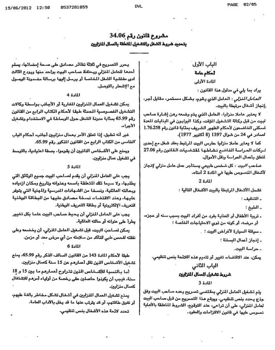 طورت الحكومة أيضاً منذ عام 2006 مشروع قانون للعمل المنزلي يضفي للمرة الأولى الطابع الرسمي على هذا القطاع ويؤسس لحقوق أساسية (مثل يوم العطلة الأسبوعية والإجازة السنوية) لعاملات المنازل. يعزز مشروع القانون الحظر القانوني القائم على عمل الأطفال تحت 15 عاماً بالعمل المنزلي، ويطالب بإذن من الأب أو ولي الأمر لتشغيل الأطفال بين 15 و18 عاماً. يطالب القانون المقترح بعقود كتابية لجميع عاملات المنازل، يتم ملأها لدى مكتب تفتيش الشغل. في مايو/أيار قال عبد الواحد سهيل وزير التشغيل والتكوين المهني لـ هيومن رايتس ووتش إن تبني القانون الجديد يُعد أولوية من أولويات الحكومة في عام 2012. لكن حتى كتابة هذه السطور لم يكن قد تم عرض القانون على البرلمان بعد.