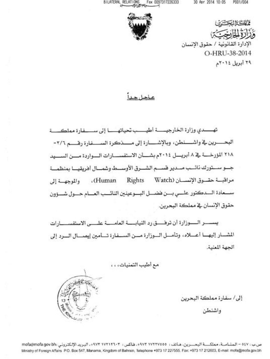 مُلحق بالتقرير كل من رسالة هيومن رايتس ووتش إلى د. علي فضل البوعينين، النائب العام البحريني، ورد مكتب النائب العام على الرسالة.