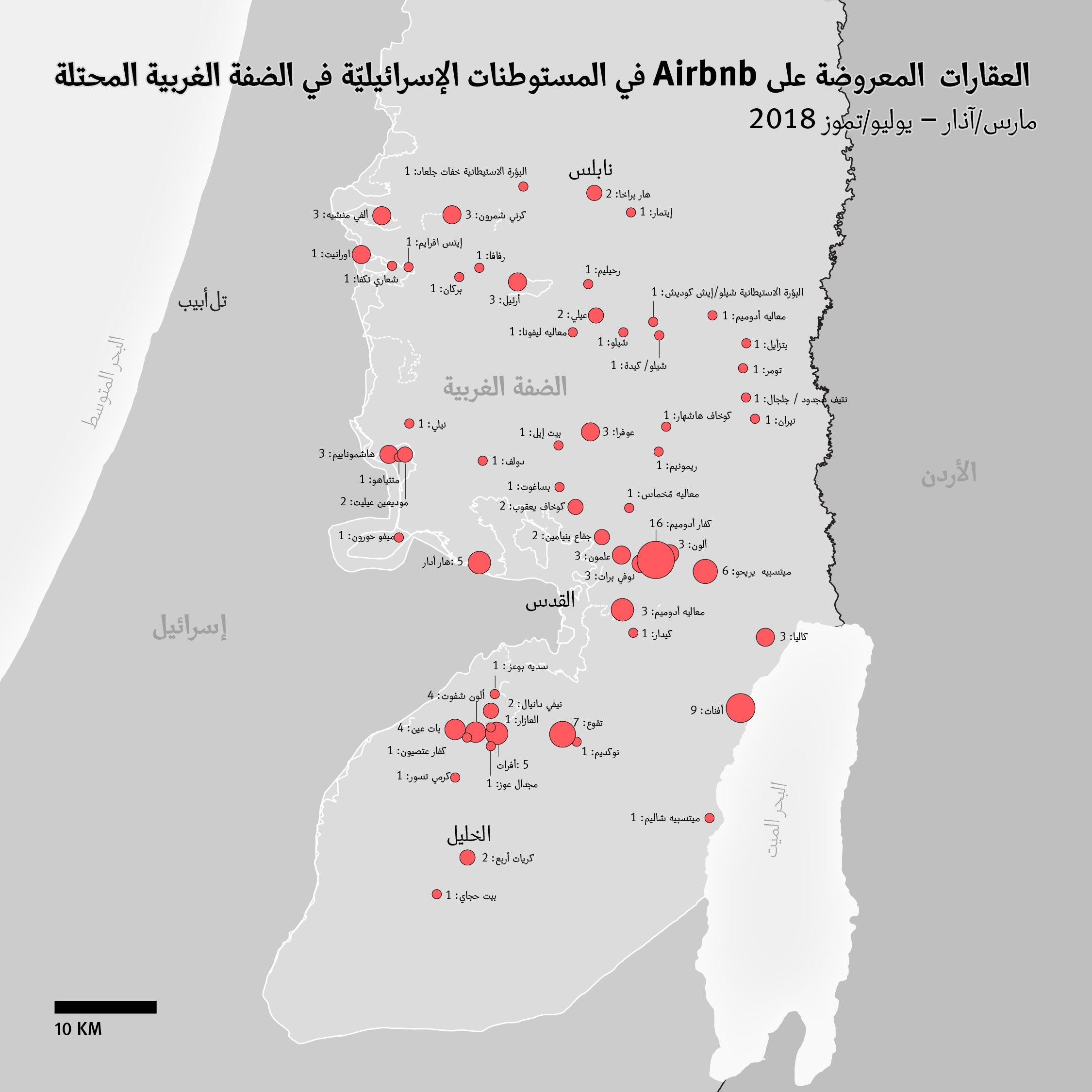 في الفترة الممتدة من 22 مارس/آذار 2018 إلى 6 يوليو/تموز 2018، وجدت هيومن رايتس ووتش وكِرِم ناڤوت 139 عرضا على Airbnb لعقارات في مستوطنات إسرائيلية في الضفة الغربية، من دون القدس الشرقية. من مجموع هذه العروض: كان يوجد 29 عرضا نشطا خلال فترة كتابة التقرير، أي أنها كانت متاحة على الجدول الزمني الخاص بالعقار الذي يمكن للزبائن المحتملين أن يحجزا بناءاً عليه. كما أن عدد العقارات الموجودة في المستوطنات غير ثابت، لأن المضيفين يمكنهم إضافة العقارات أو إزالتها كما يحلو لهم بحرية. يُمكن الاطلاع على قائمة العقارات المعروضة في الفترة المعنية في التقرير هنا.