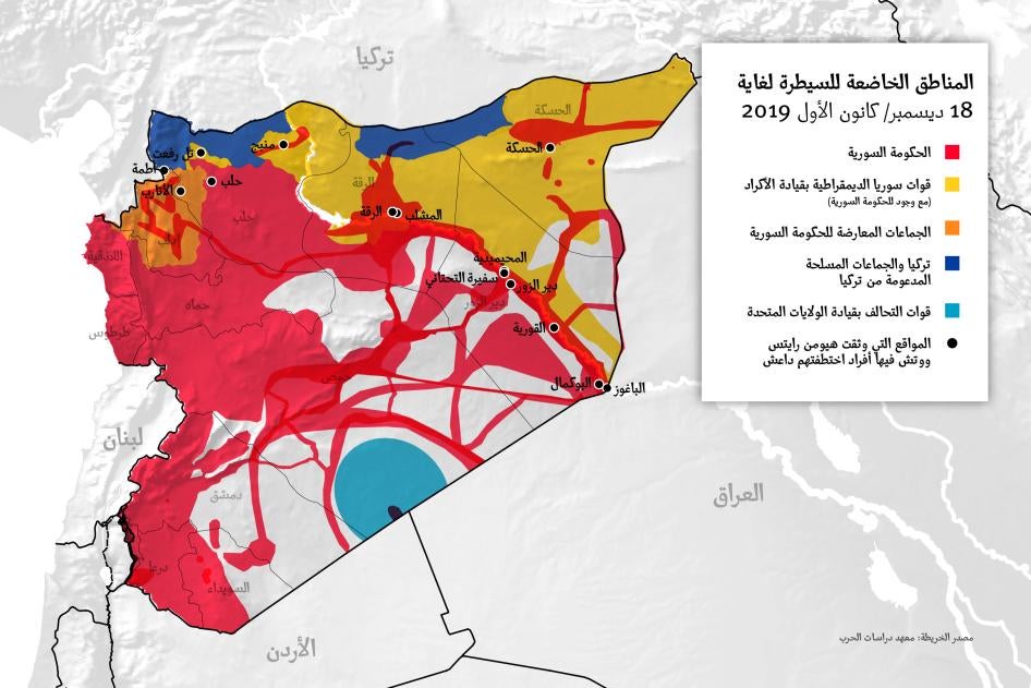 بالنظر إلى اتساع نطاق السيطرة الإقليمية التي تمتع بها داعش في أوج قوته من 2014 إلى 2016/2017، وتغير الجهات المسيطرة على المناطق في شمال شرق سوريا، فإن هيومن رايتس ووتش توجه هذه التوصيات إلى جميع السلطات التي تسيطر على المناطق في سوريا حيث كان الأفراد الذين اختطفهم التنظيم، بما في ذلك مناطق الحكم الذاتي في شمال وشرق سوريا، وقوات سوريا الديمقراطية التابعة لها، والمناطق التي تسيطر عليها الحكومة السورية، وتركيا، والمجموعات المسلحة المدعومة من تركيا.