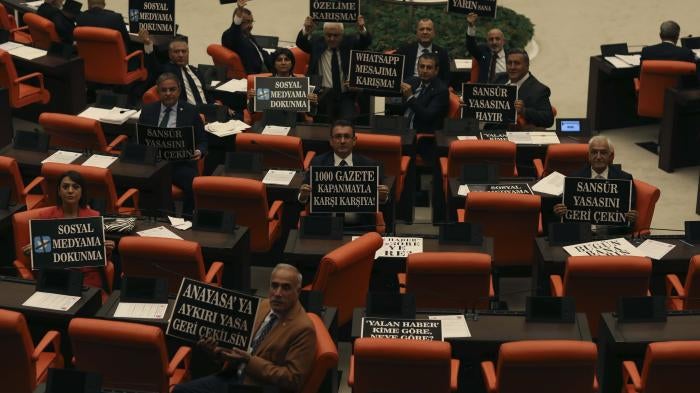 أعضاء معارضون في البرلمان يحملون لافتات تحتج على قانون اقترحته حكومة إردوغان لتجريم المعلومات الزائفة وتشديد السيطرة على وسائل التواصل الاجتماعي كمحاولة لزيادة الرقابة تمهيدا لانتخابات 2023. 11 أكتوبر/تشرين الأول 2022.