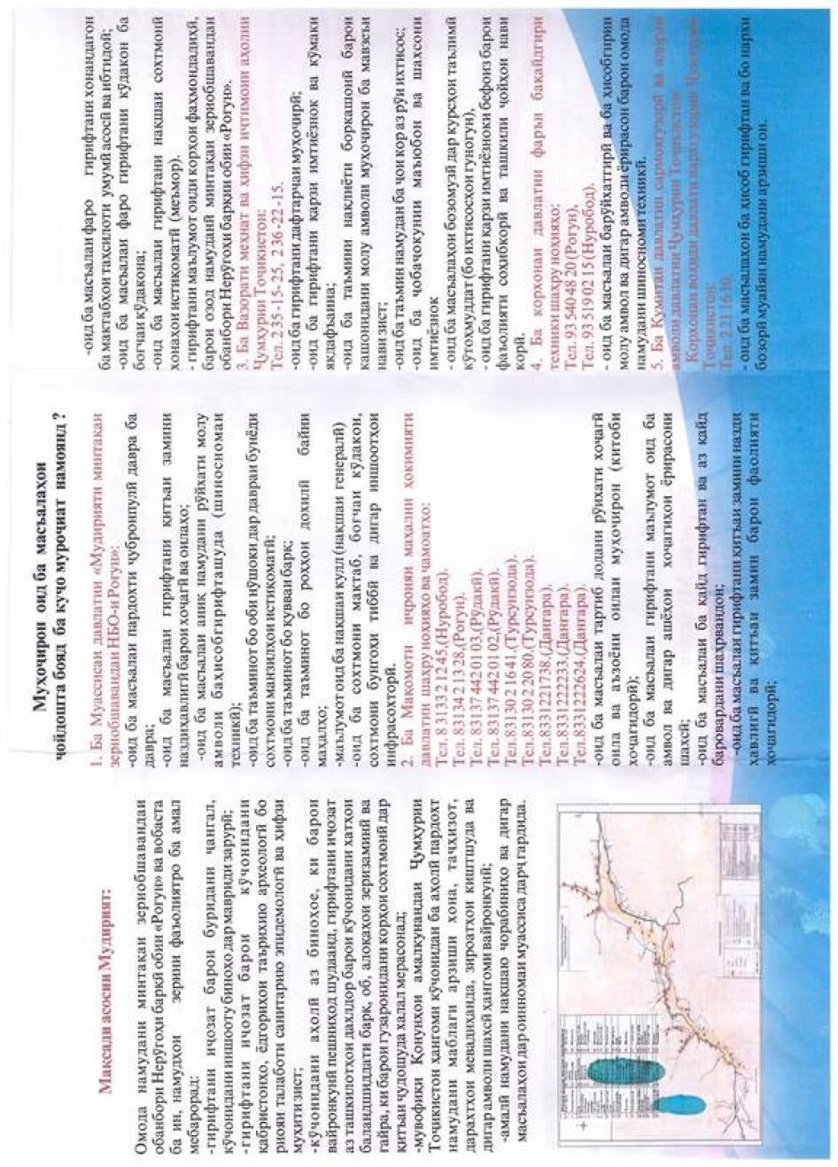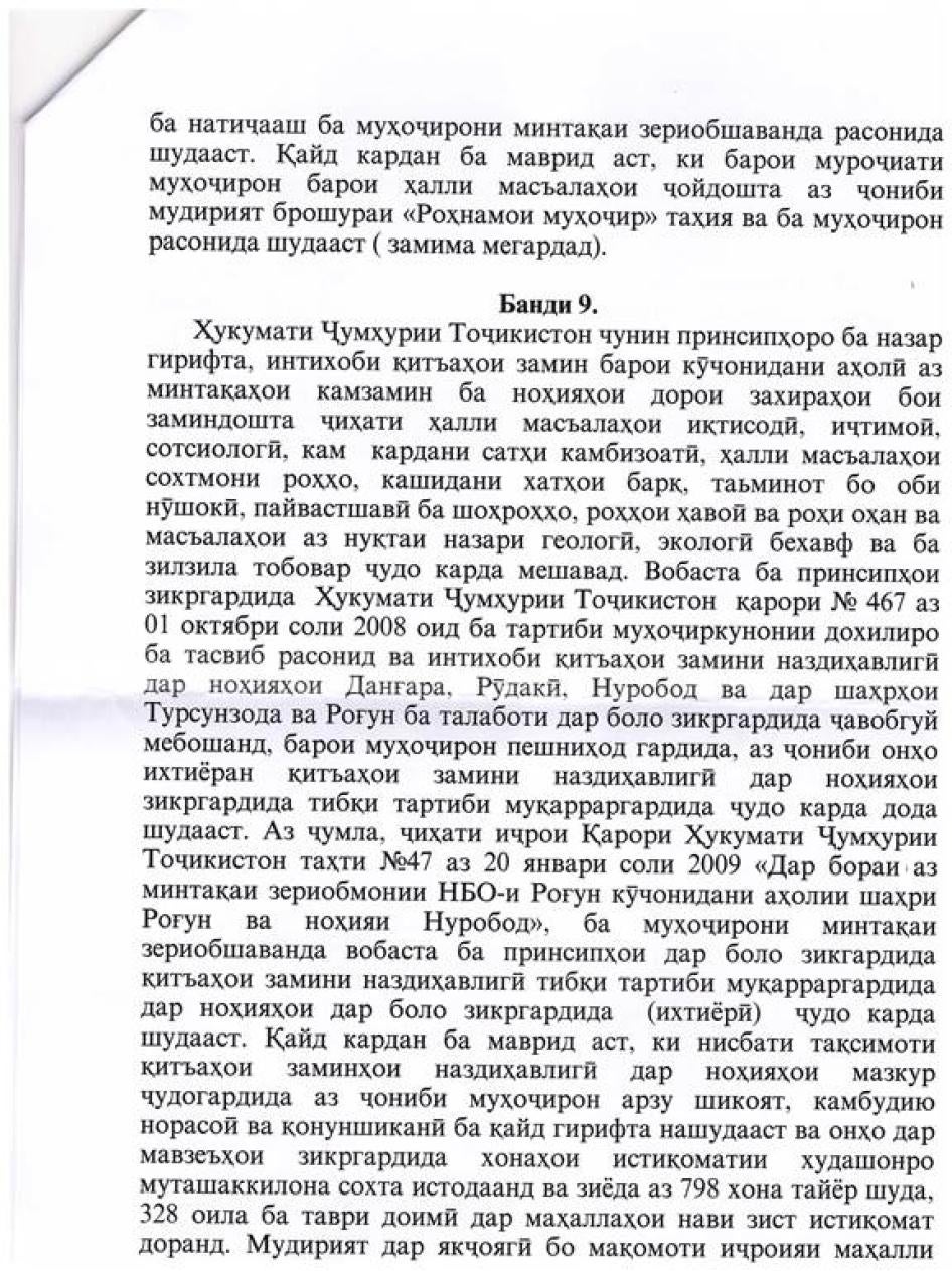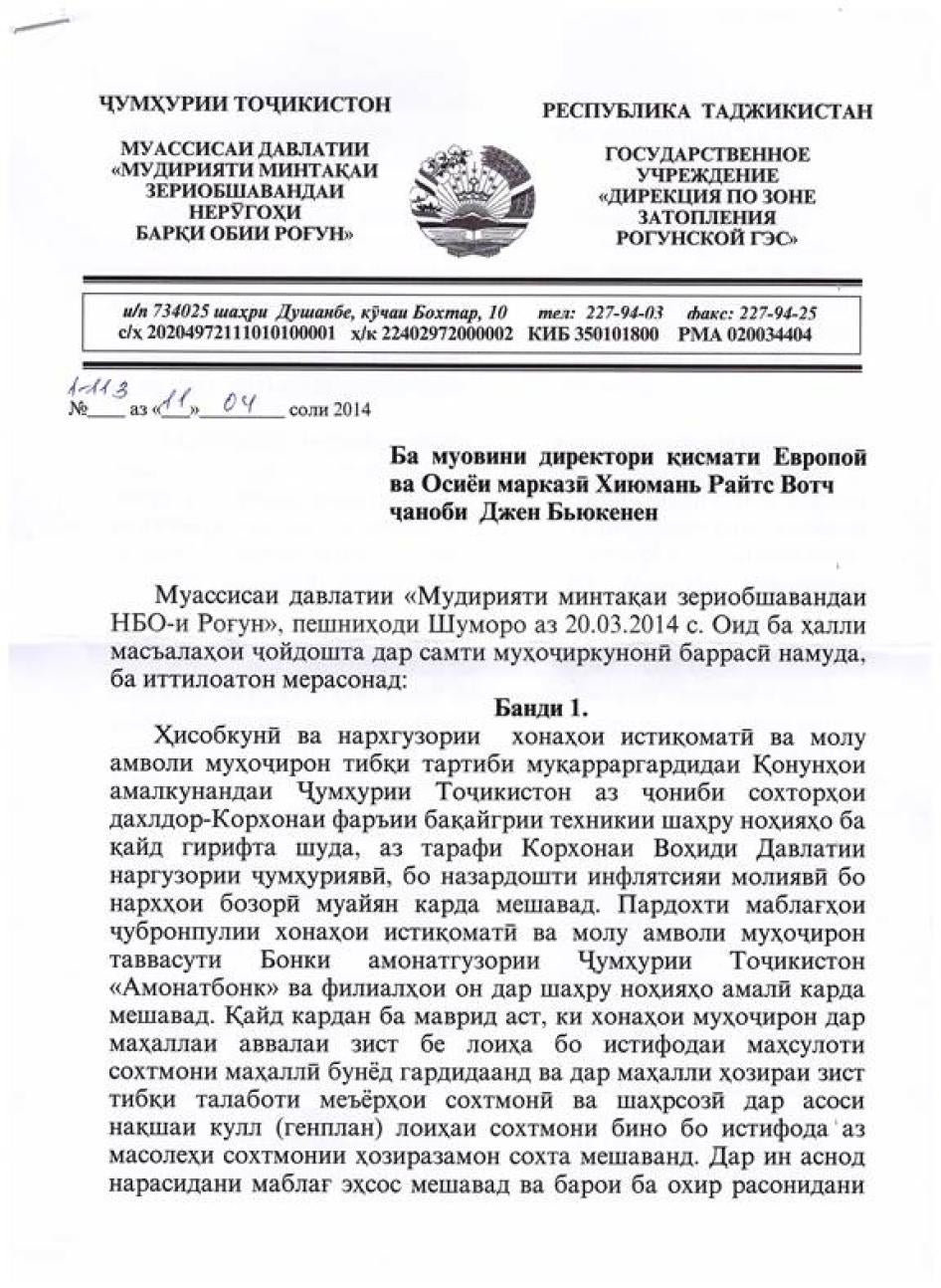 [249] Мусоҳибаи Созмони Дидбони ҳуқуқи башар бо Рамазон Мирзоев - директори муассисаи давлатии Мудирияти минтақаи зериобшавандаи НБО "Роғун", 23 ноябри соли 2013. Агар масъала ба салоҳияти Мудирияти минтақаи зериобшаванда дахл дошта бошад, он шикоятро ҳал мекунад, дар акси ҳол, он шикоятро ба муассисаи дигар ё суд равона мекунад. Мудирияти минтақаи зериобшаванда, мақомоти маҳаллӣ ва як қатор вазоратҳо барои ҷанбаҳои мухталифи кӯчонидан масъул ҳастанд. Фармони ҳукумат таҳти № 47, январи соли 2009.
