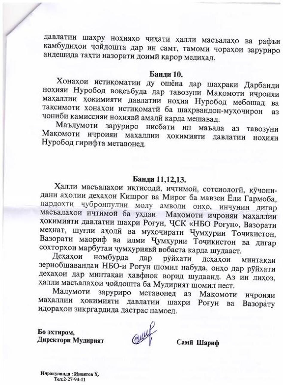 [250] Мактуб аз Самӣ Шариф - директори Муассисаи давлатии Мудирияти минтақаи зериобшавандаи НБО "Роғун", 11 апрели соли 2014, параграфи 8.