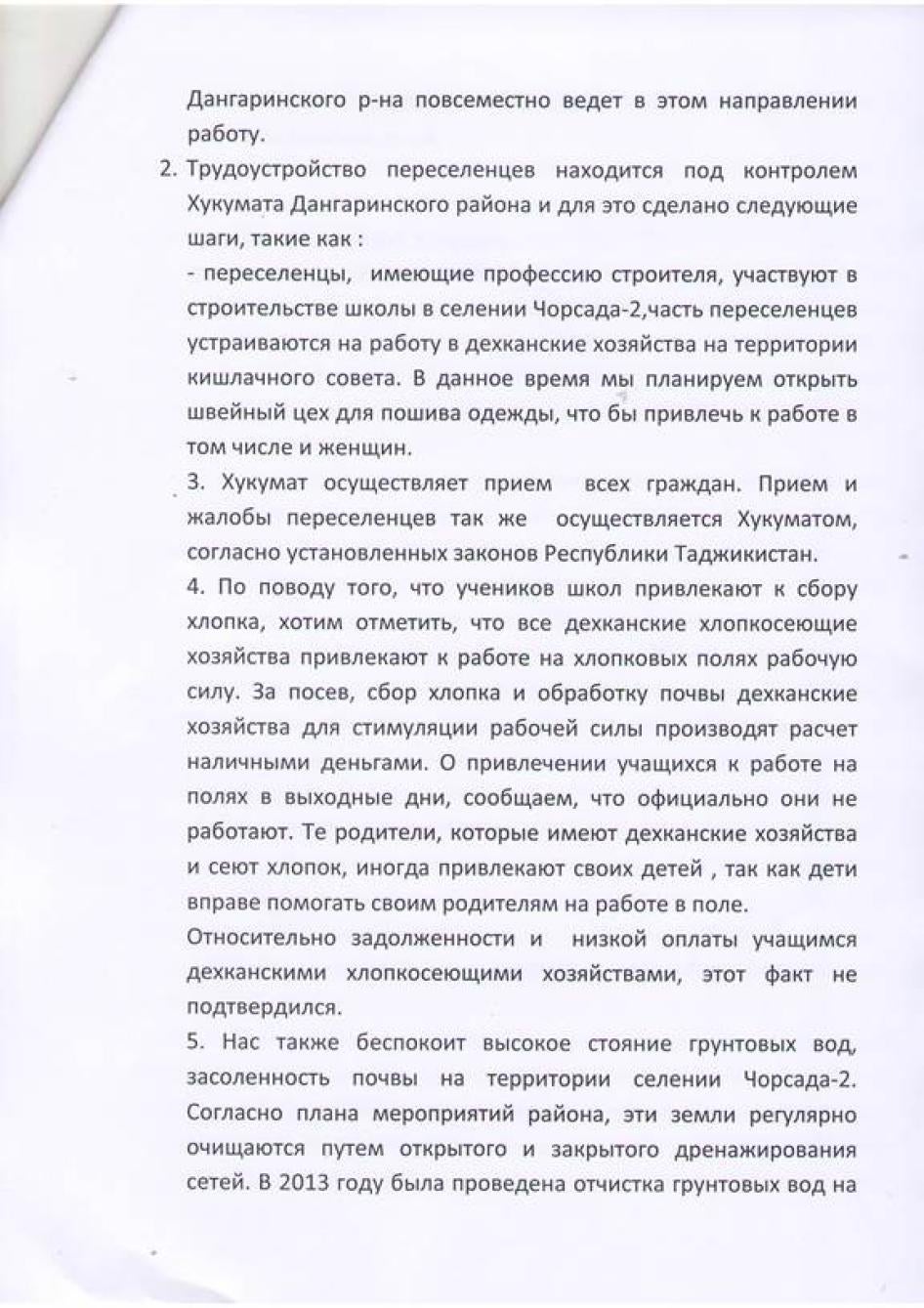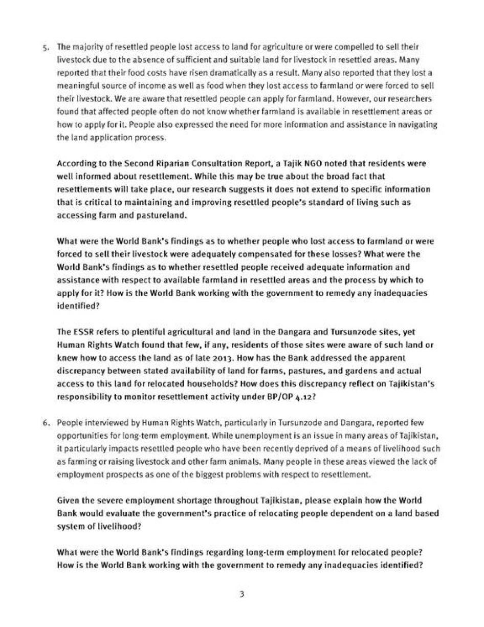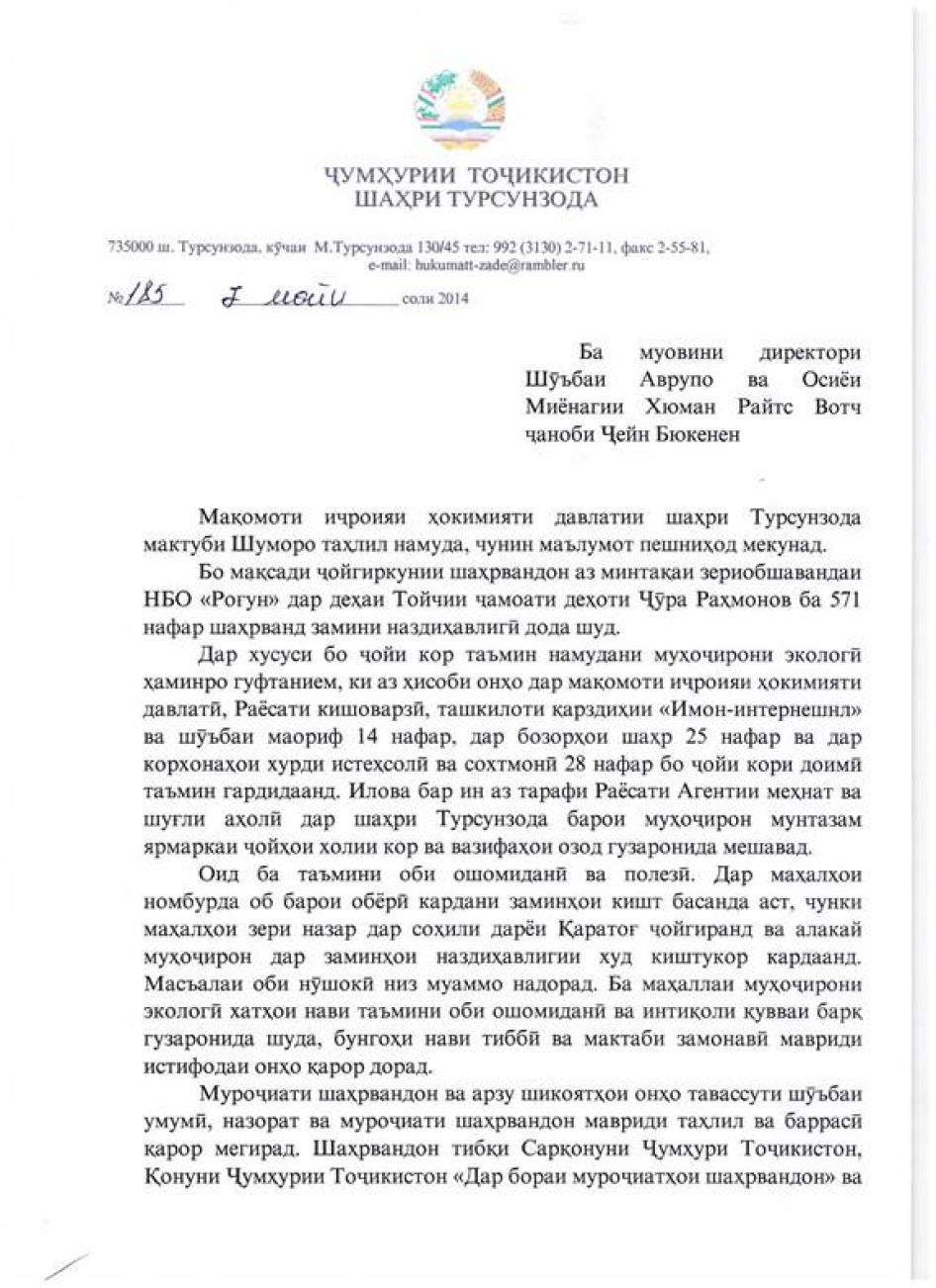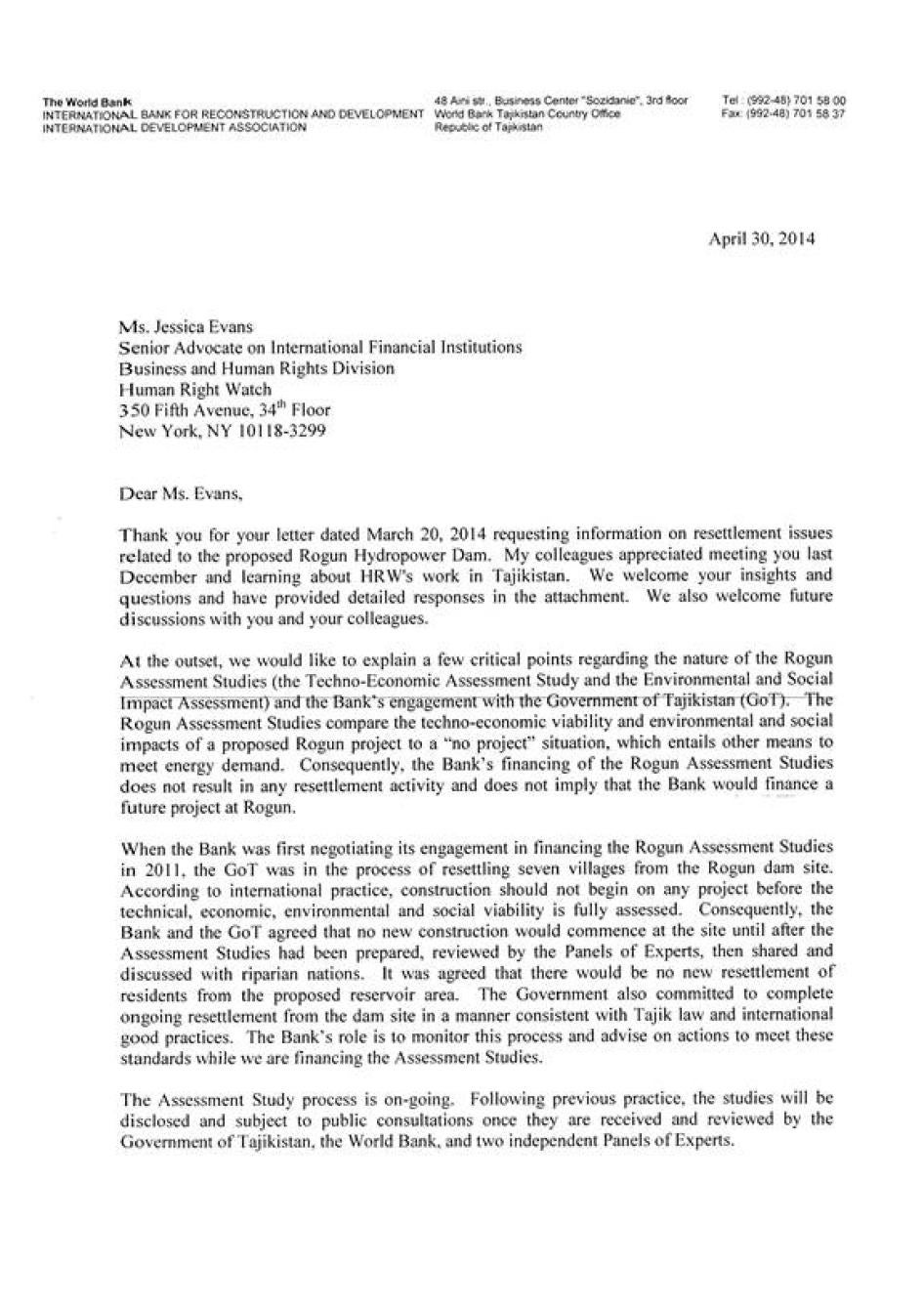 [253] Мактуб аз Марша Олив, менеҷери кишварии идораи Бонки ҷаҳонӣ дар Тоҷикистон ба Созмони Дидбони ҳуқуқи башар, 30 апрели соли 2014.