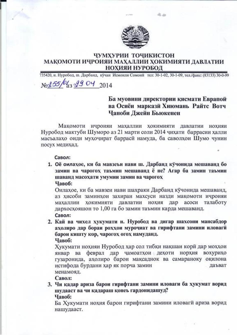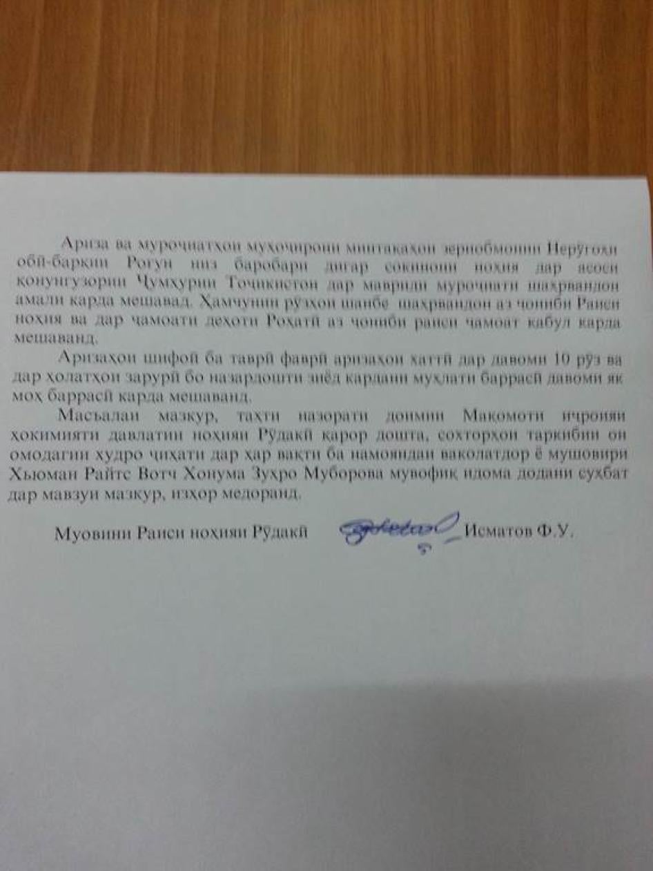 [258] Мактуб аз Ф.У. Исматов - муовини раис, ноҳияи Рӯдакӣ ба Созмони Дидбони ҳуқуқи башар, апрели соли 2014.