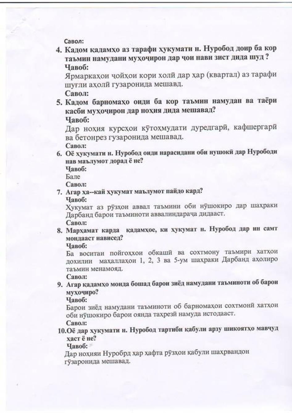[252] Мусоҳибаи Созмони Дидбони ҳуқуқи башар бо Монӣ Р., деҳаи Тойчӣ, 17 ноябри соли 2014. Ба ҳамин монанд, Паймон Ҷ., ки дар ин охирҳо ба ноҳияи Турсунзода кӯчонида шудааст, ба Созмони Дидбони ҳуқуқи башар гуфт: "Ҳеҷ кас аз мо намепурсад, ки мо чӣ хел зиндагӣ мекунем, ба чӣ ниёз дорем." Мусоҳибаи Созмони Дидбони ҳуқуқи башар бо Паймон Ҷ., деҳаи Тойчӣ, 11 ноябри соли 2013.