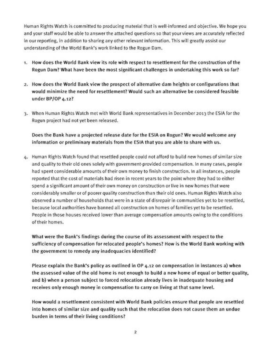 Дар моҳи феврали соли 2014 Созмони Дидбони ҳуқуқи башар баъзе бозёфтҳои ибтидоиро зимни мулоқот бо мӯҳтарам Мирзоев мубодила намуд. Баъдан мо ба Мудирияти минтақаи зериобшавандаи НБО "Роғун", идораи сарвазир, мақомоти маҳаллии масъул барои ҷомеаҳои кӯчонидашуда дар ноҳияҳои Данғара, Нуробод, Рӯдакӣ ва Роғун ва Бонки ҷаҳонӣ номаҳо фиристодем. Дар ин номаҳо мо тамоми бозёфтҳои худро табодул кардем ва посухи гирандаҳоро дархост намудем. 17 июни соли 2014 ҳангоме ки ин гузориш барои нашр омода мешуд, Бонки ҷаҳонӣ лоиҳаи Арзёбии таъсироти муҳитизистӣ ва иҷтимоӣ ва хулосаи Таҳқиқоти арзёбии техникиву иқтисодӣ ва инчунин ҳуҷҷати худи бонкро бо номи "Масъалаҳои асосӣ барои дар назар гирифтан дар Лоиҳаи НБО "Роғун" нашр кард. Дар ин ҳолат, Созмони Дидбони ҳуқуқи башар имкон надошт, ки ин арзёбиҳоро пеш аз нашр пурра таҳлил намояд ва ин кор дар давраи эзоҳнависӣ, яъне аз 17 июн то 29 июли соли 2014 анҷом шуда, ба Бонки ҷаҳонӣ супорида мешавад.