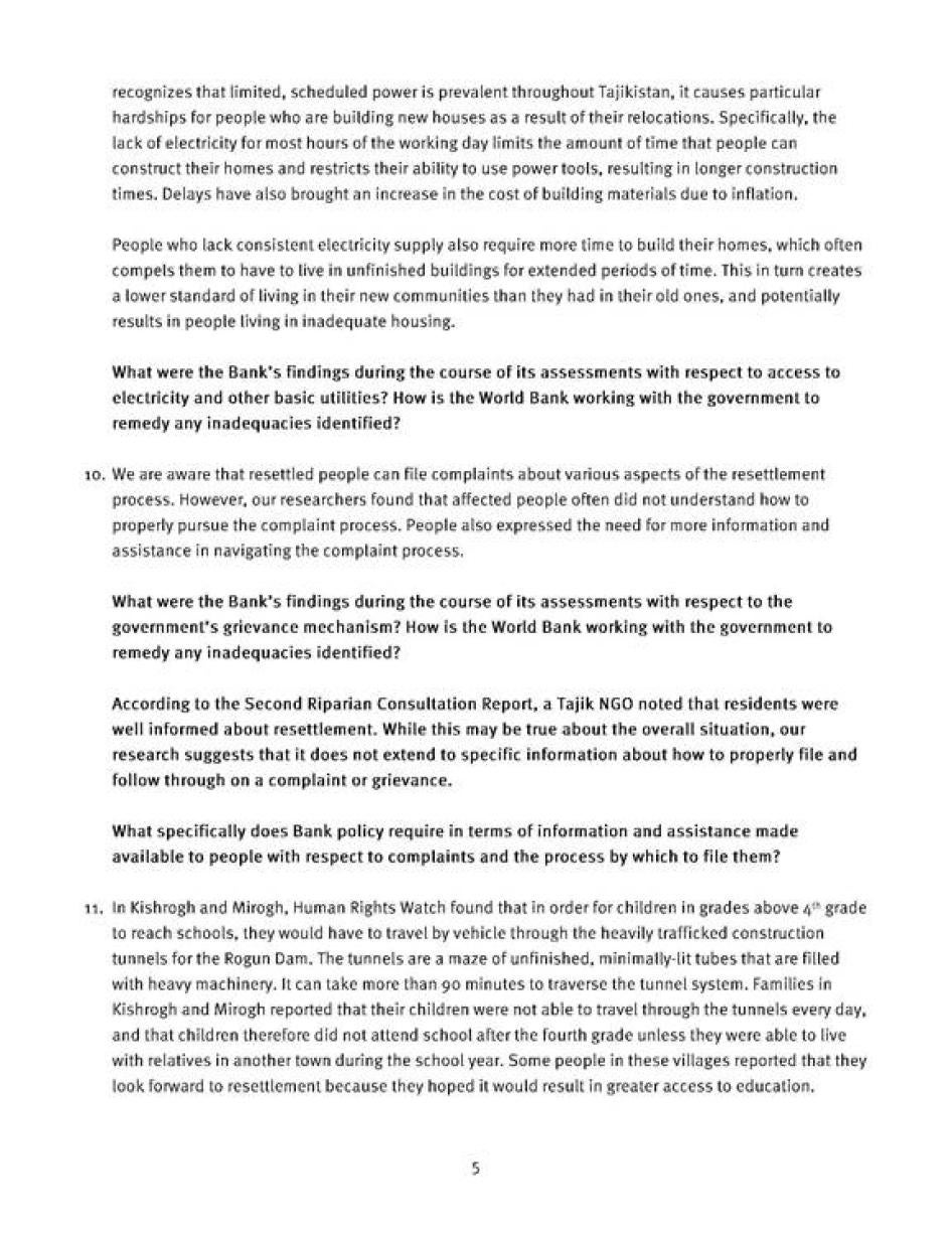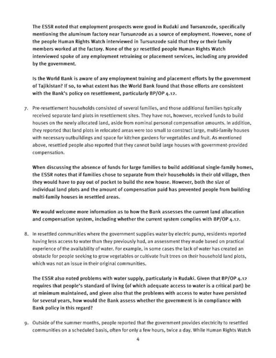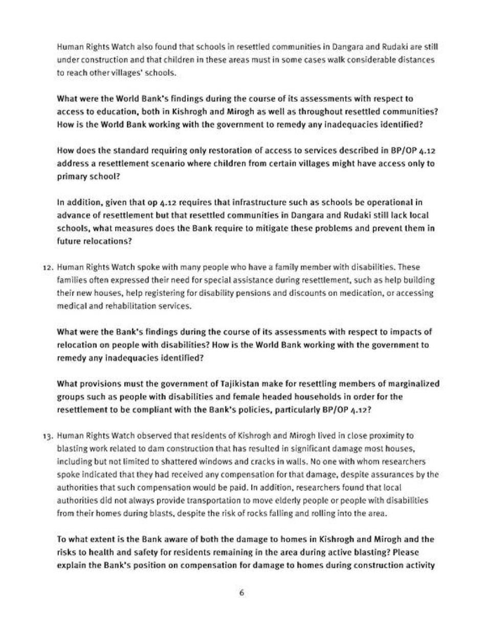 [280] Бонки ҷаҳонӣ, Сиёсати амалиётӣ, 4.12, Кӯчонидани ғайриихтиёрӣ. Сиёсатҳои Бонки ҷаҳонӣ аз чанд нигоҳ аз қонуни байналмилалии ҳуқуқи башар маҳрум аст: Нигаред: Рушди озод аз ҳуқуқвайронкунӣ: Чӣ гуна Бонки ҷаҳонӣ бояд одамонро аз поймошавии ҳуқуқи инсониашон ҳимоят кунад, июли соли 2013, http://www.hrw.org/sites/default/files/reports/worldbank0713_ForUpload.pdf.