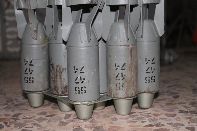 Des bombes à fragmentation AO-1SCh non explosées, larguées en Syrie en octobre 2012 à partir d’une bombe à sous-munitions RBK-250 (de fabrication soviétique).
