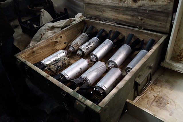Plusieurs sous-munitions retrouvées à Stakhanov, dans l’est de l’Ukraine, suite à une attaque menée le 23 janvier 2015.