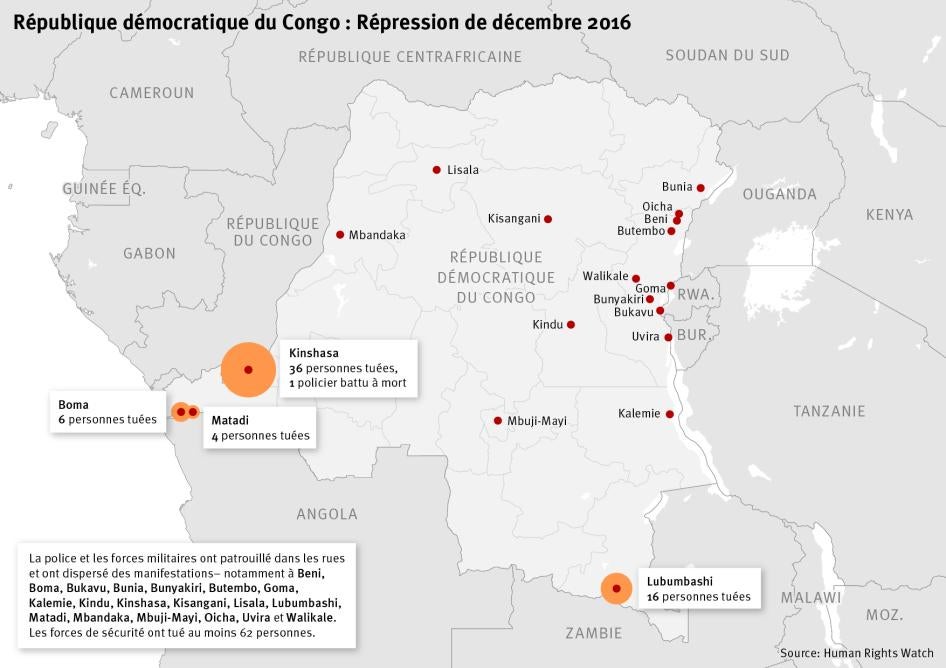 Le 19 décembre, le dernier jour du second et – selon la Constitution – dernier mandat du président Kabila, les forces de sécurité se sont massivement déployées dans les villes du pays. Les groupes de 10 personnes ou plus ont été avertis qu’ils seraient dispersés de force. Cela semblait être une tentative délibérée de dissuader les manifestants de descendre dans les rues. Des « villes mortes » ou grèves générales ont été organisées à travers le pays ; les boutiques et les entreprises étaient fermées et de nombreuses personnes sont restées chez elles et n’ont pas mis leurs enfants à l’école. Bon nombre de ceux qui ont osé manifester ont été arrêtés.