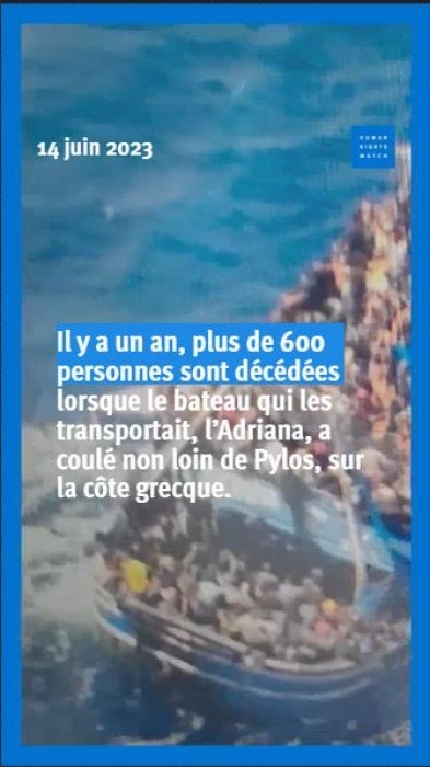 Le 13 juin 2023, les autorités grecques ont été alertées au sujet d’un chalutier surpeuplé, l’Adriana, dans leur zone de recherche et de sauvetage ; il a coulé 15 heures plus tard. Six mois plus tard, des recherches menées par Human Rights Watch et Amnesty International, parmi d’autres organisations, ont révélé diverses défaillances des autorités grecques dans les heures qui ont précédé le naufrage, ainsi que de graves allégations selon lesquelles un navire de patrouille des garde-côtes grecs a fait chavirer le chalutier en tentant de le remorquer.