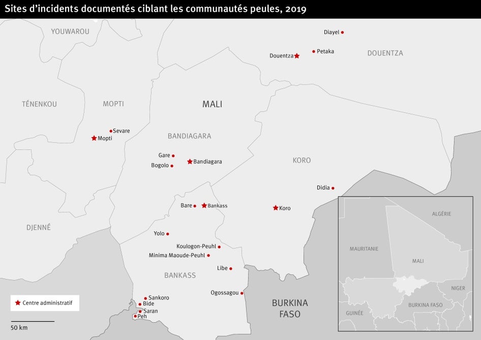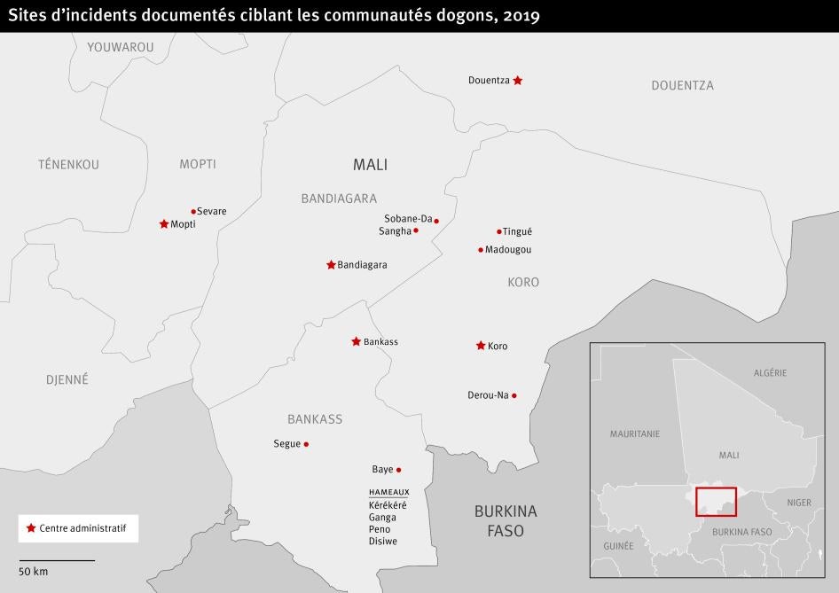 Les exactions décrites ont été commises entre janvier et novembre 2019, dans les cercles administratifs de Bandiagara, Bankass, Douentza, Koro et Mopti. Hormis quelques exceptions, les victimes des attaques documentées par Human Rights Watch étaient majoritairement des Peuls, parmi lesquels on compte 284 morts, suivis des Dogons, avec 56 morts.
