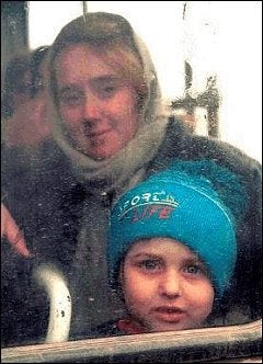 Una madre y su hija miran desde un autobus en el cruze de frontera con Ingushetia, el 11 de diciembre de 1999, esperando el regreso a su hogar en Urus-Martan, Chechenia. Miles de decenas de refugiados han regresado a Chechenia después de buscar alojo en Ingushetia. Muchas familias tienen que regresar porque no pueden sostener los costos de vida en Ingushetia o porque no tienen dinero.