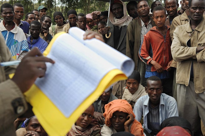 Residents of the southern Ethiopian district of Boricha wait for a regional government official to call their names outside a makeshift food distribution center.