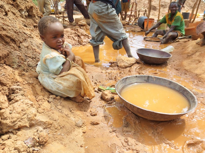 Four-year-old girl in Tanzania plays in an amalgamation pond contaminated with mercury while adults process gold.