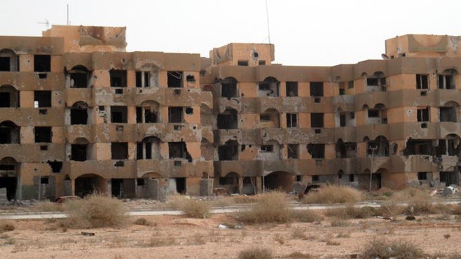A once-inhabitated apartment block, ridden with bullet holes, stands abandoned in Tawergha on February 21, 2013.