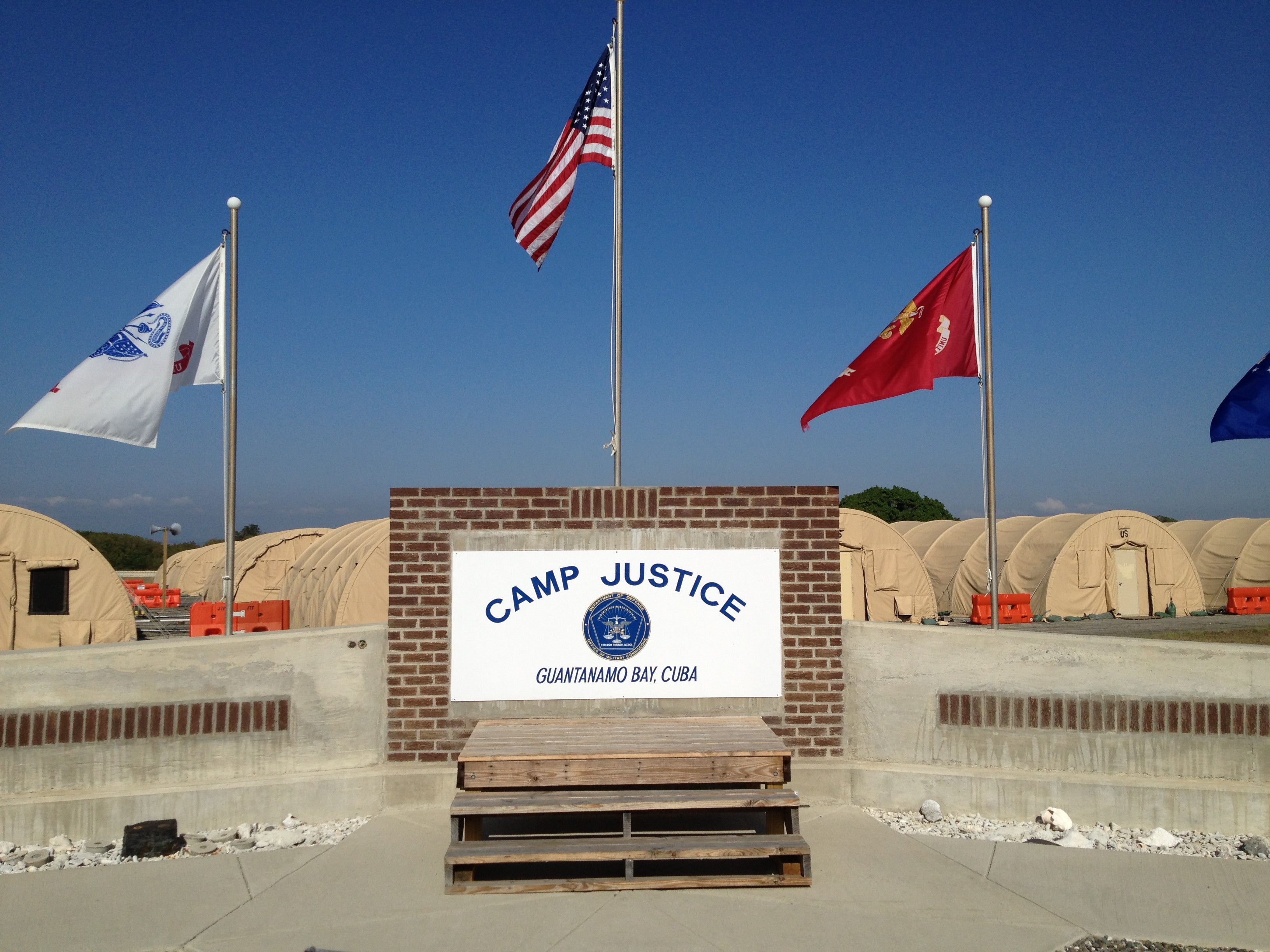 Flags fly above the sign for Camp Justice at Guantanamo Bay.