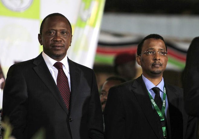 President elect Uhuru Kenyatta (L) and the Independent Electoral and Boundaries Commission (IEBC) Chairman Issack Hassan stand for the national anthem in Nairobi on March 9, 2013.