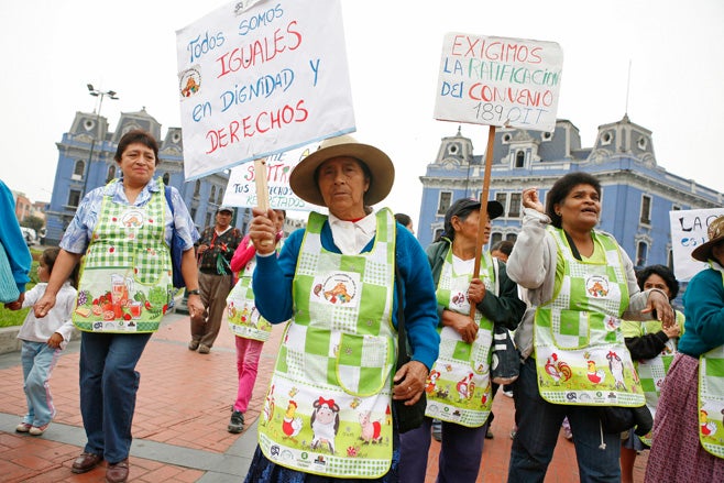 Domestic workers in downtown Lima, Peru demonstrate to demand labor protections, June 15, 2012. The placards (L-R) read, “We all have the same dignity and rights” and “We demand the ratification of the 189 ILO Convention.”