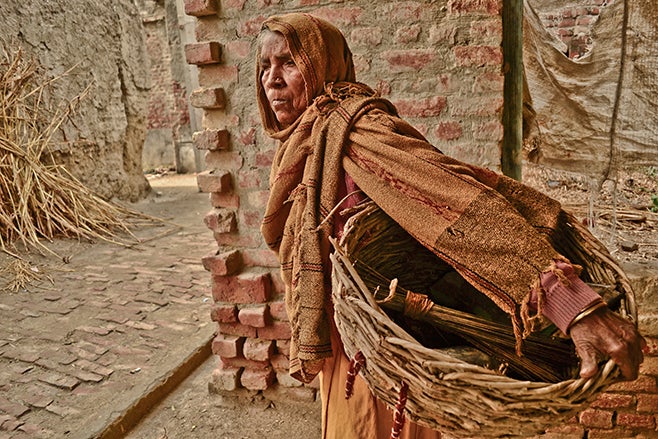 Gangashree walks through the village to manually clean human excrement from dry toilets in Kasela, Uttar Pradesh, which she will collect in her basket and carry to the outskirts of the village for disposal.