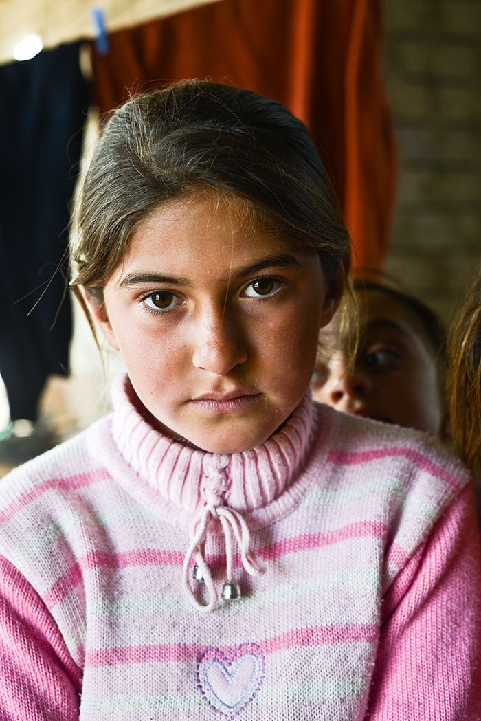 A displaced Yezidi girl living in an unfinished building outside Dohuk, northern Iraq. Many displaced girls said they no longer attend school and have little to keep them occupied in the camps or settlements.