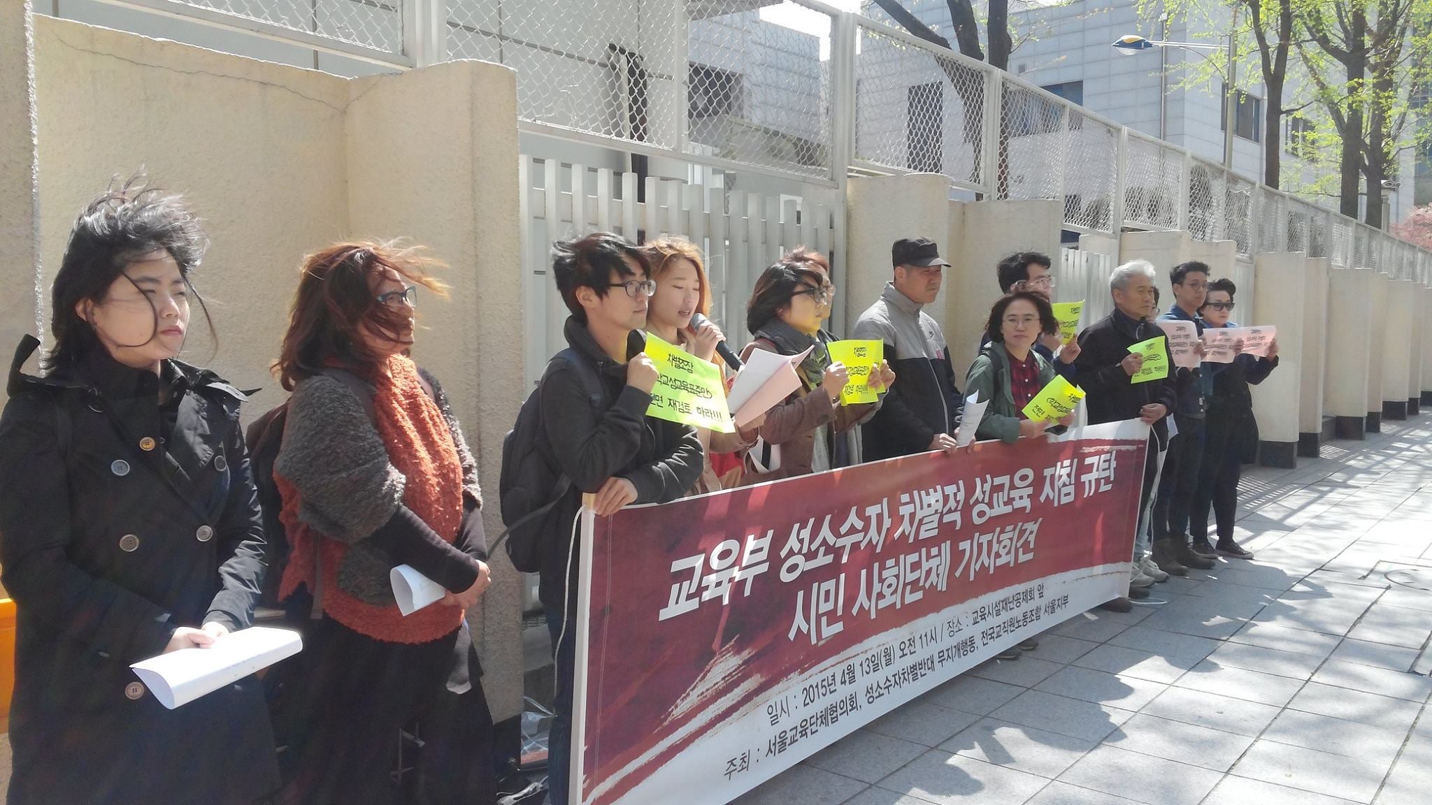 Representatives of the KTU’s (Korean Teachers and Education Workers Union) Seoul branch protest a new government sex education policy which fails to include homosexuality or sexual minorities.