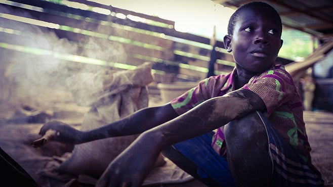 A 13-year-old boy works in artisanal and small-scale gold mining in Obuasi. He dropped out of school at the age of 12 and would like to continue his education.