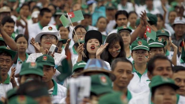 Supporters react during a a ruling Union Solidarity and Development Party (USDP) campaign rally in Rangoon, Burma on October 10, 2015.