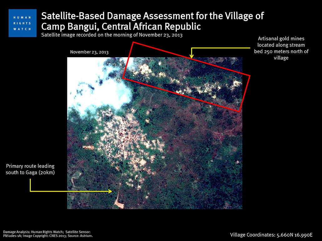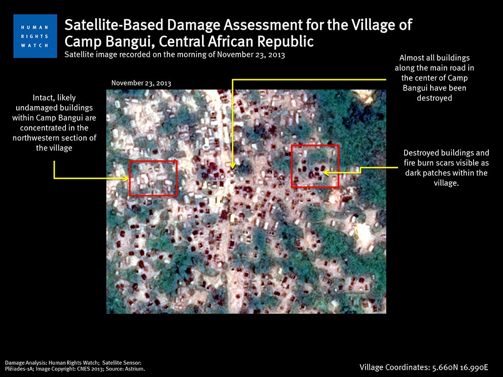 As the conflict escalates within the Central African Republic, leaving scores of villages burned to ground and hundreds of thousands of civilians displaced, Human Rights Watch is actively documenting major human rights abuses and war crimes on the ground and via satellite imagery.