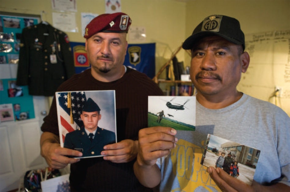 Hector Barajas, left, and Fabian Rebolledo show photographs of themselves from when they were in the US Army. Both were deported to Mexico after felony convictions, despite their military service and having US-born children. The two formed a support group to help deported US veterans around the world and to lobby for changes to US immigration law. © 2012 David Maung