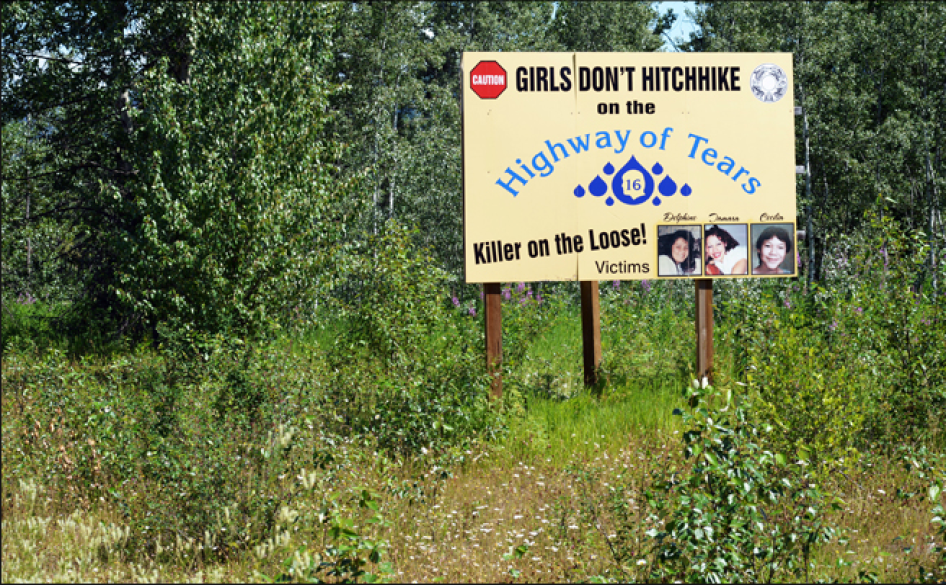 In northern British Columbia, a highway sign warns girls of the dangers of hitchhiking along the Highway of Tears. © 2012 Samer Muscati