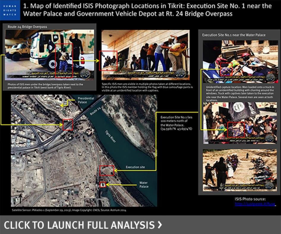 Using satellite imagery, Human Rights Watch mapped the crime scene. The aerial and ground imagery revealed five execution sites within the presidential palaces complex in Tikrit where ISIS fighters slaughtered between 560 and 770 men. A survivor gave a detailed account of being captured, feigning death, and managing to escape. At the time, we warned that the death toll was likely to climb.