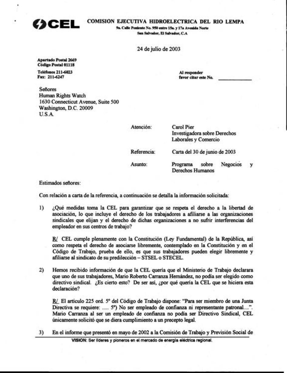 [409] E-mail message from Gilberto Garca, director, CEAL, to Human Rights Watch, July 3, 2003.
