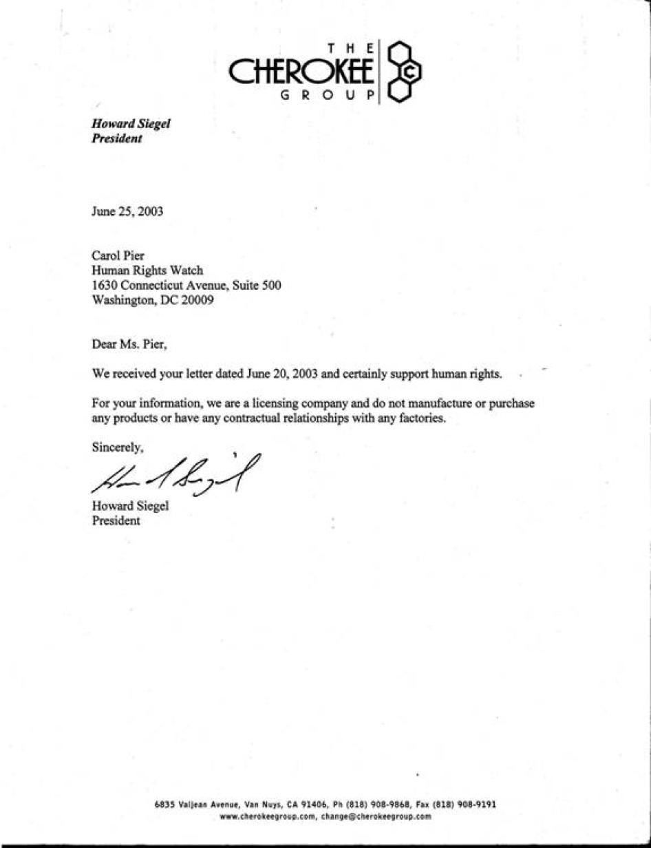 [429] Letter from Howard Siegel, president, The Cherokee Group, to Human Rights Watch, June 25, 2003.