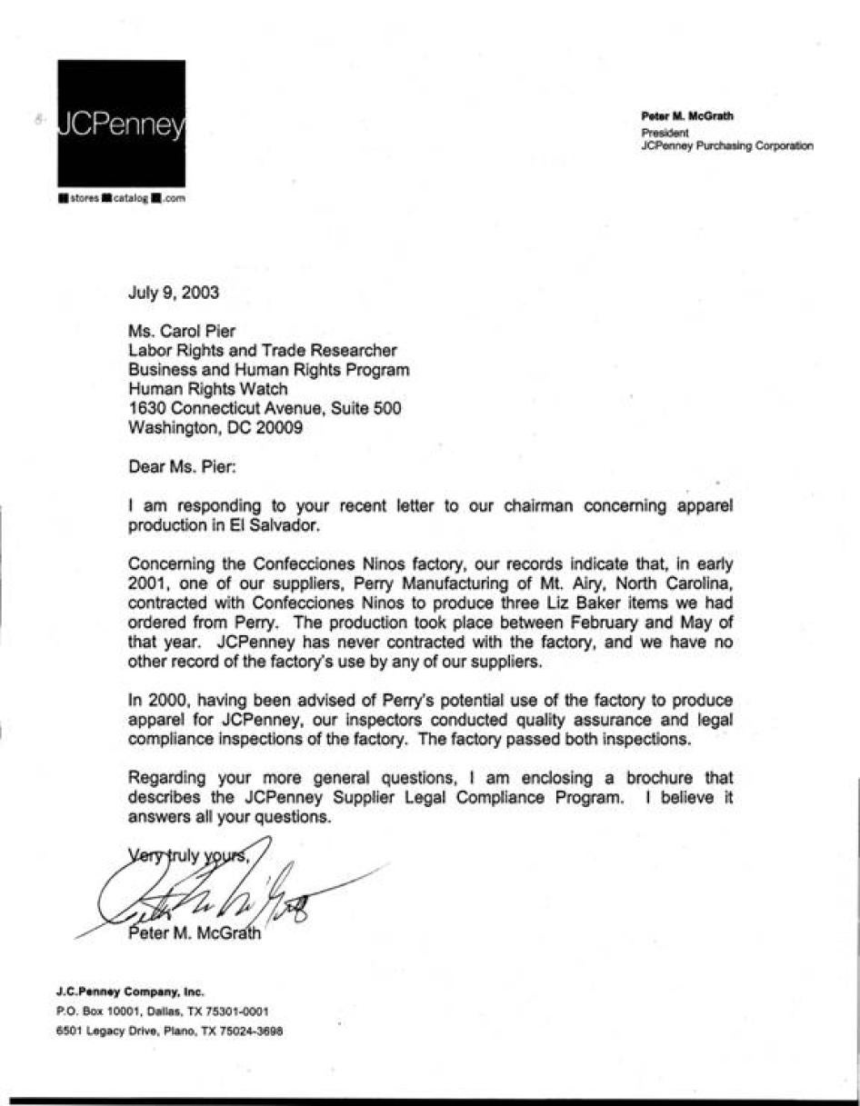 [416] Letter from Peter M. McGrath, president, JC Penney Purchasing Corporation, to Human Right Watch, July 9, 2003.