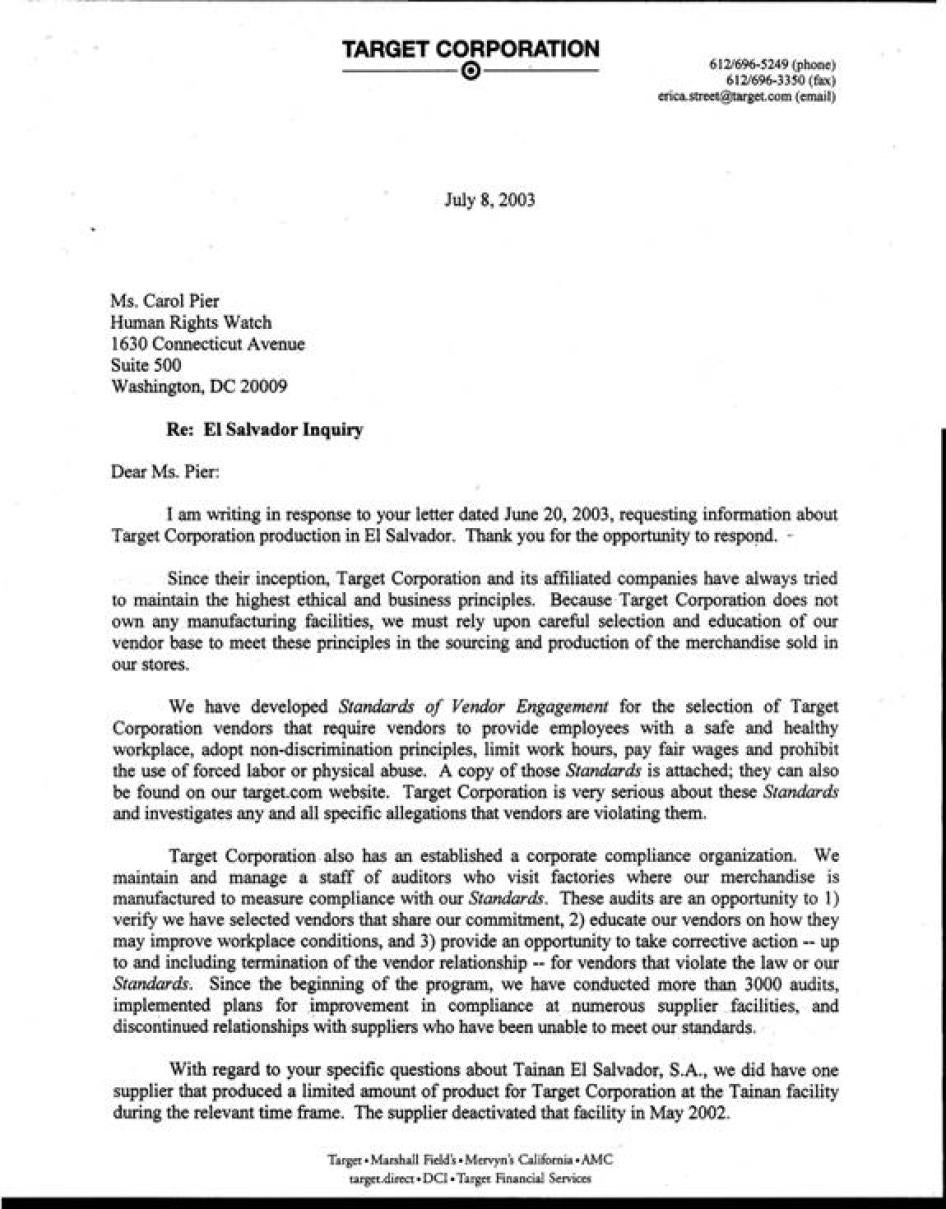 [430] Letter from Erica C. Street, president, Target Brands, Inc., to Human Rights Watch, July 8, 2003.