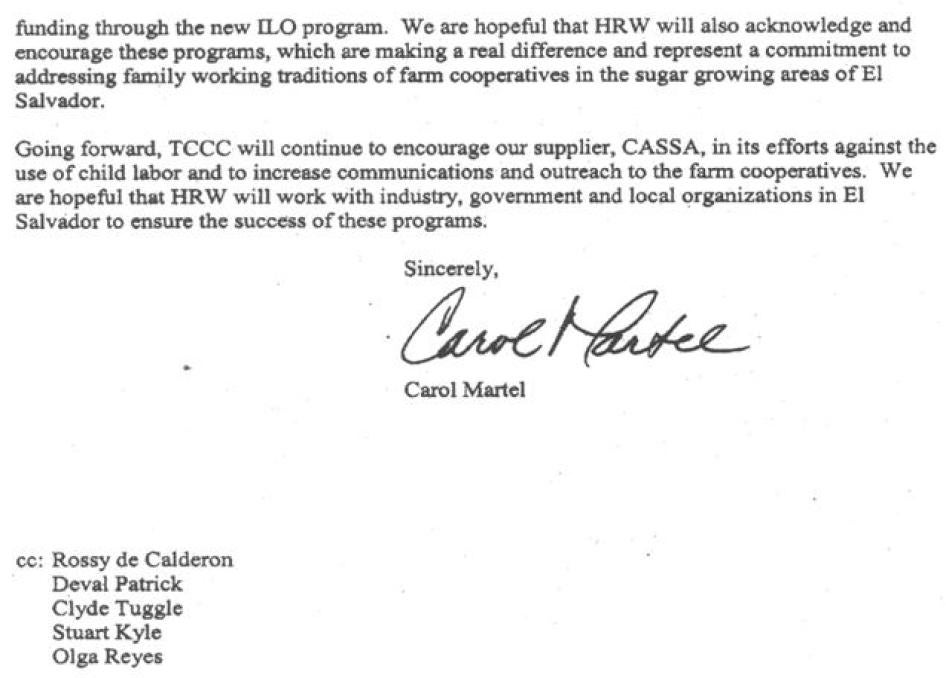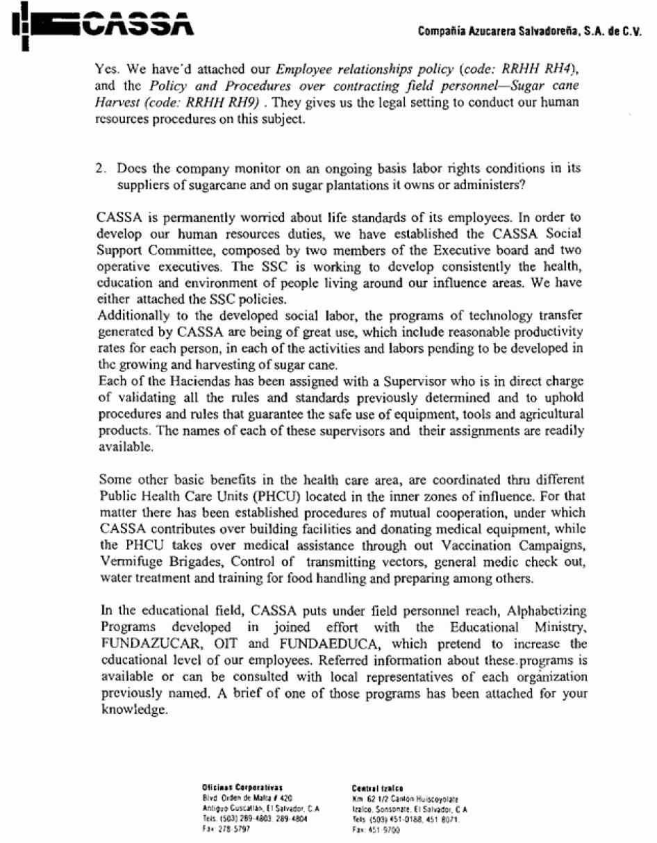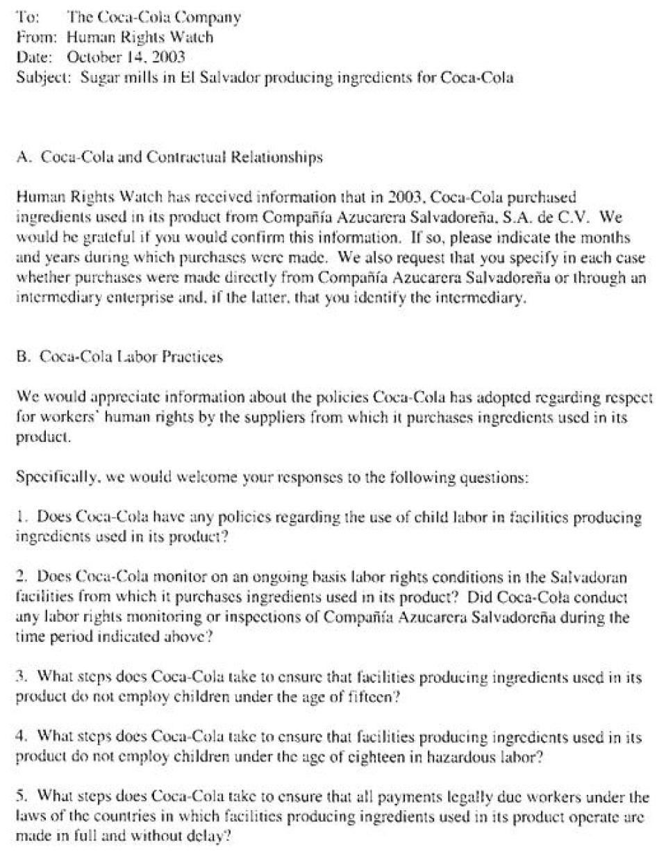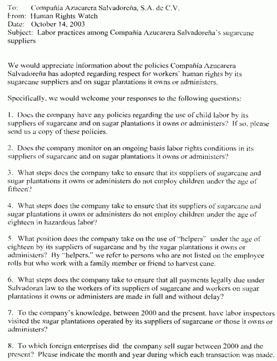 [253]Letter from Michael Bochenek to Compaa Azucarera Salvadorea, October 14, 2003.