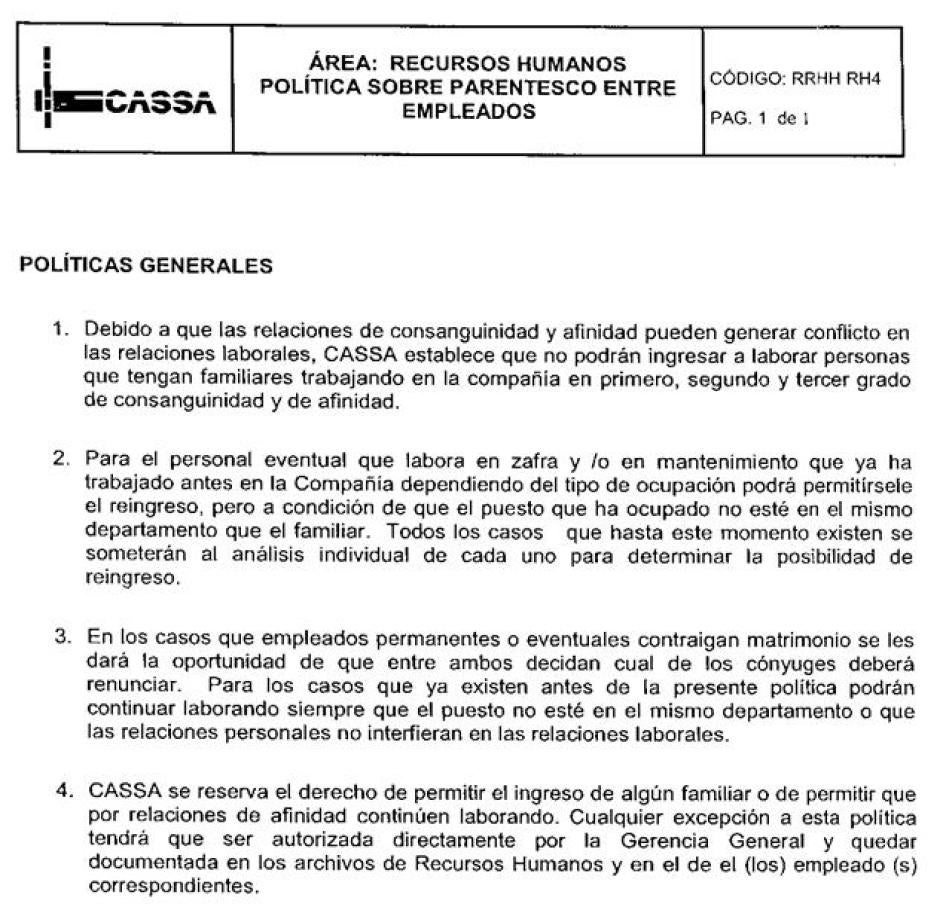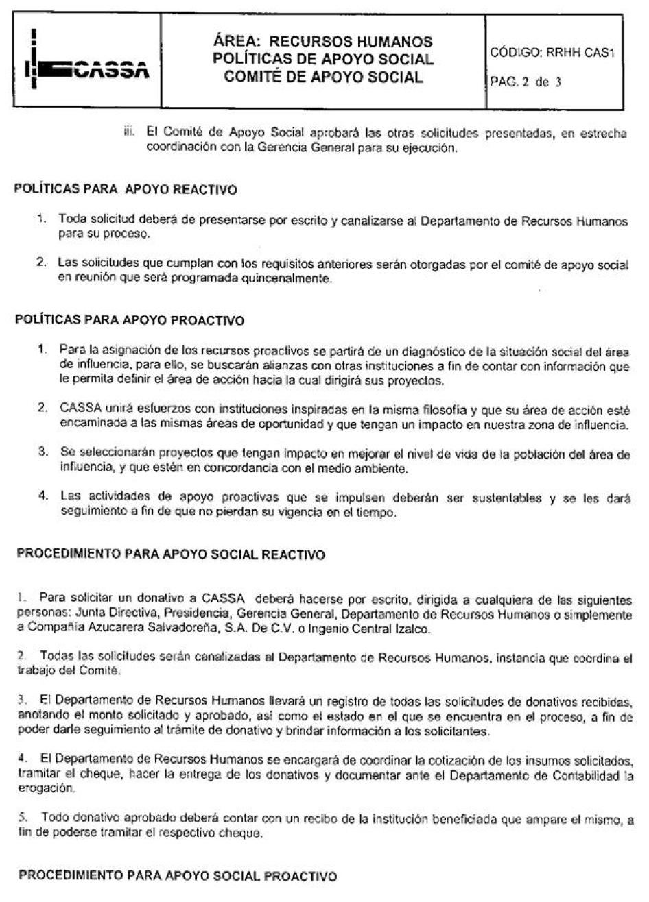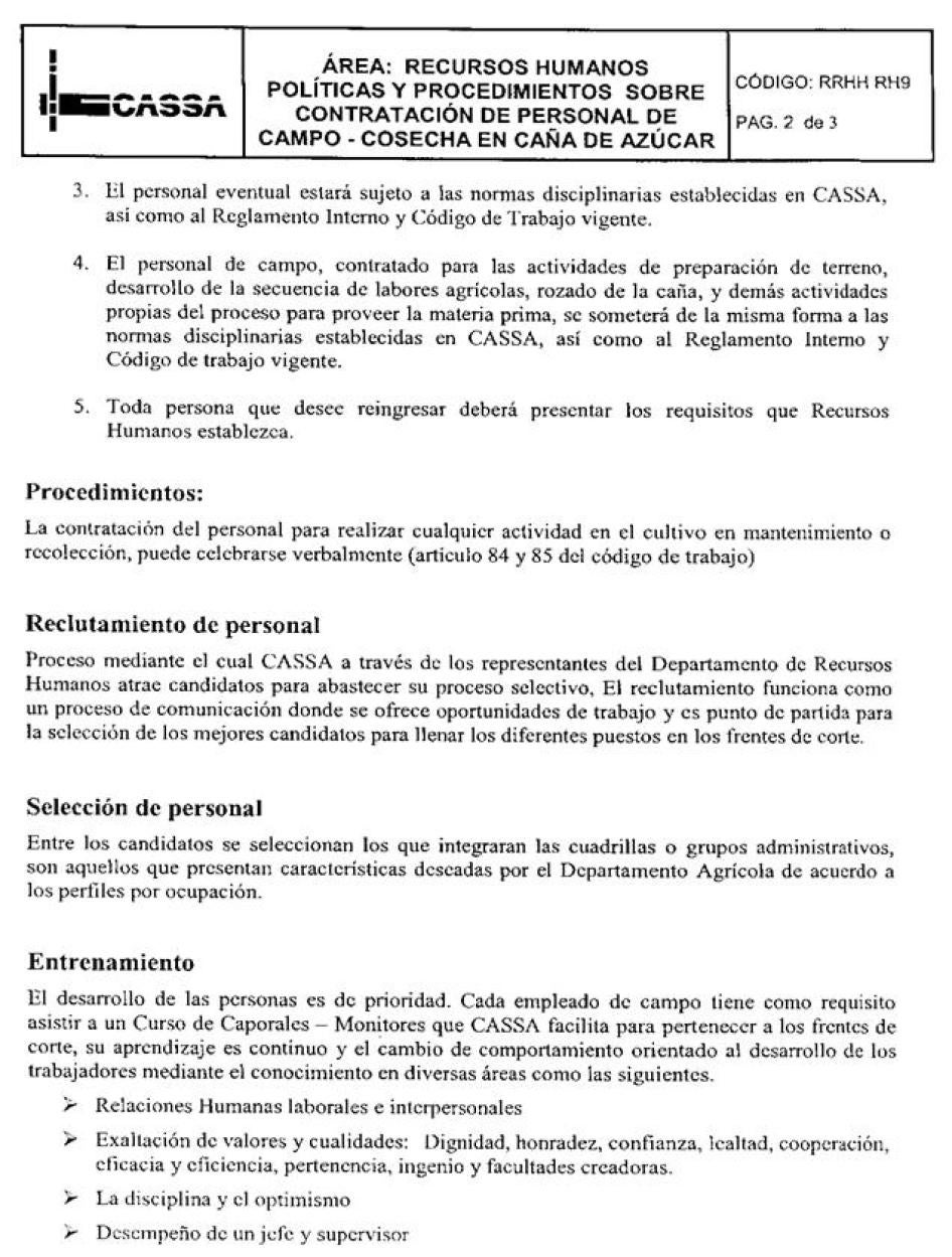 [254] See Compaa Azucarera Salvadorea, S.A. de C.V., Area:Recursos humanos:Polticas y procedimientos sobre contratacin de personal de campo-cosecha en caa de azcar, cd. RRHH RH9, n.d., p. 2.